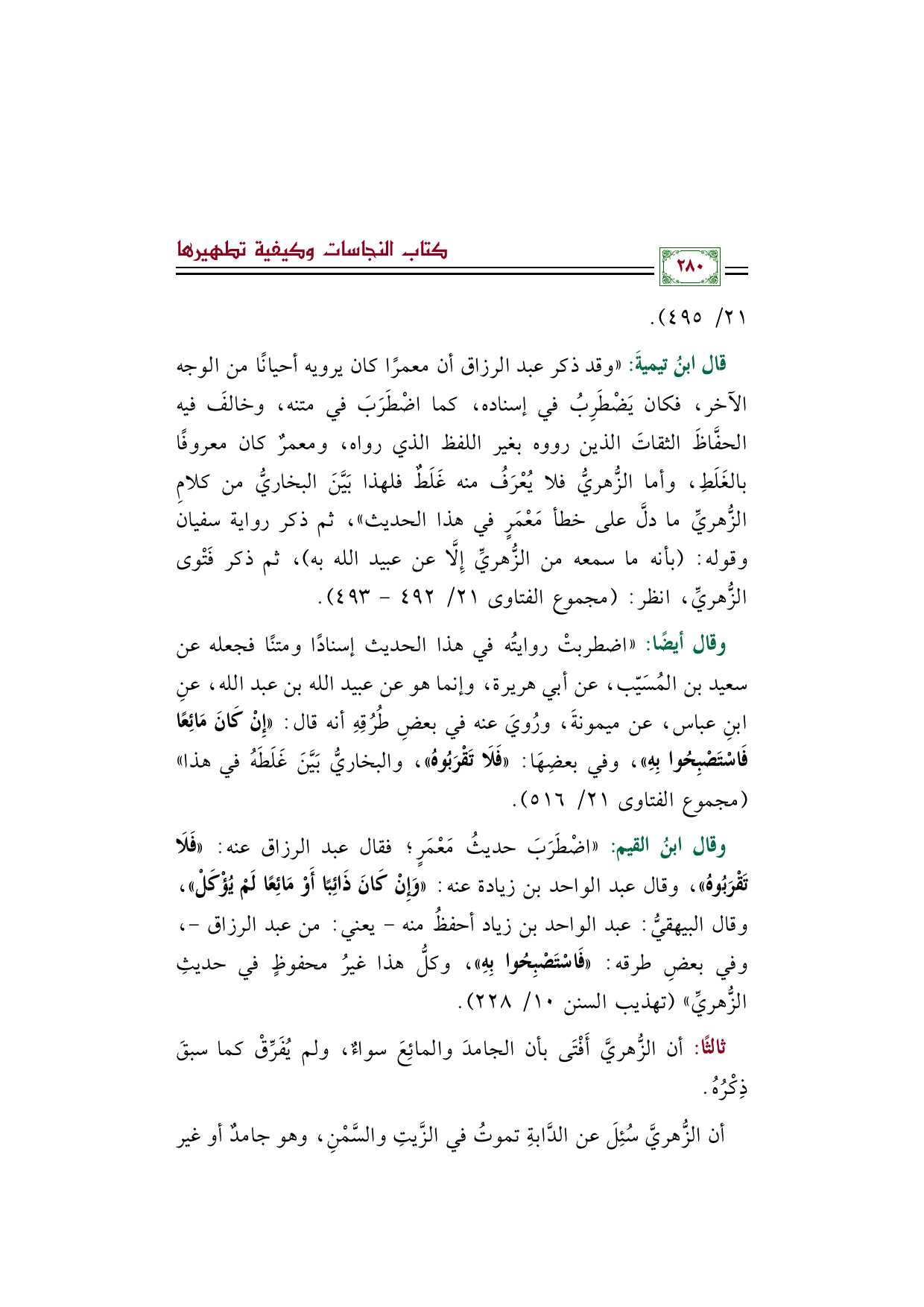 وقال ابنُ القيم: ((اضْطَرَبَ حديثُ مَعْمَرٍ؛ فقال عبد الرزاق عنه: ((فَلَا تَقْرَبُوهُ))، وقال عبد الواحد بن زيادة عنه: ((وَإِنْ كَانَ ذَائِبًا أَوْ مَائِعًا لَمْ يُؤْكَلْ))، وقال البيهقيُّ: عبد الواحد بن زياد أحفظُ منه -يعني: من عبدالرزاق-، وفي بعضِ طرقه: ((فَاسْتَصْبِحُوا بِهِ))، وكلُّ هذا غيرُ محفوظٍ في حديثِ الزُّهريِّ)) (تهذيب السنن ١٠/ ٢٢٨).