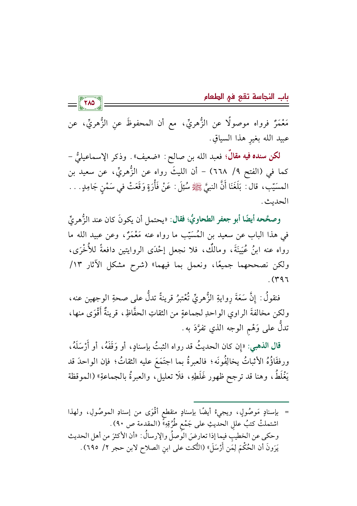 لكن سنده فيه مقالٌ؛ فعبد الله بن صالح: ((ضعيف)). وذكر الإسماعيليُّ -كما في (الفتح ٩/ ٦٦٨) - أن الليثَ رواه عن الزُّهريِّ، عن سعيد بن المسَيّب، قال: بَلَغَنَا أَنَّ النبيَّ صلى الله عليه وسلم سُئِلَ: عَنْ فَأْرَةٍ وَقَعَتْ في سَمْنٍ جَامِدٍ ... الحديث.
