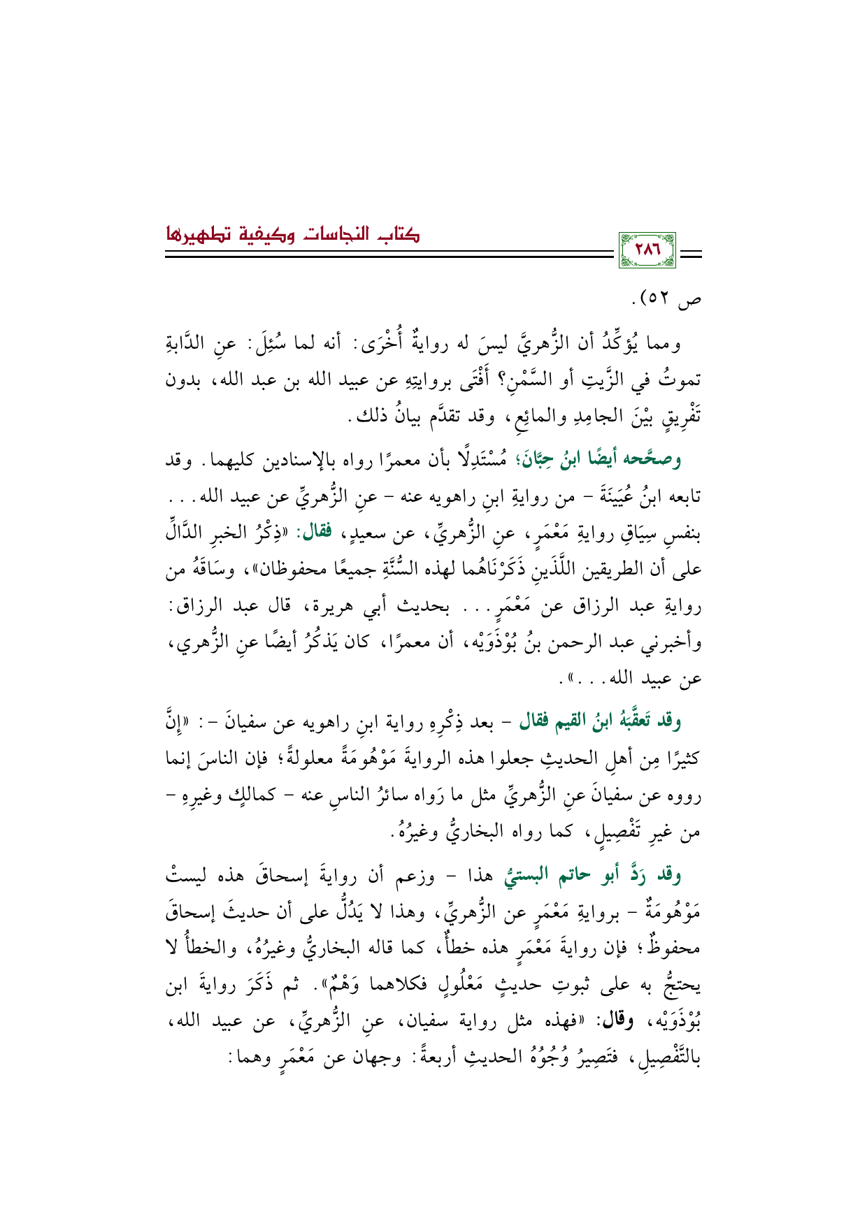 وقد تَعقَّبَهُ ابنُ القيم فقال -بعد ذِكْرِهِ رواية ابنِ راهويه عن سفيانَ-: ((إِنَّ كثيرًا مِن أهلِ الحديثِ جعلوا هذه الروايةَ مَوْهُومَةً معلولةً؛ فإن الناسَ إنما رووه عن سفيانَ عنِ الزُّهريِّ مثل ما رَواه سائرُ الناسِ عنه -كمالكٍ وغيرِهِ- من غيرِ تَفْصِيلٍ، كما رواه البخاريُّ وغيرُهُ.