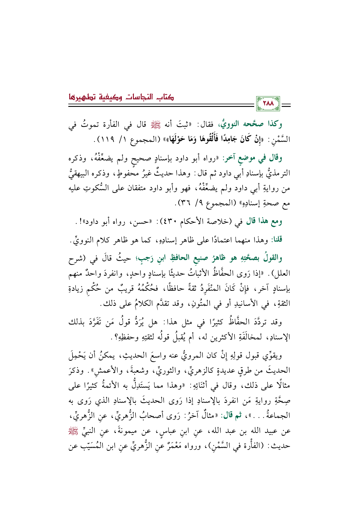 وكذا صحَّحه النوويُّ، فقال: ((ثبتَ أنه صلى الله عليه وسلم قال في الفأرة تموتُ في السَّمْنِ: ((إِنْ كَانَ جَامِدًا فَأَلْقُوهَا وَمَا حَوْلَهَا)))) (المجموع ١/ ١١٩).