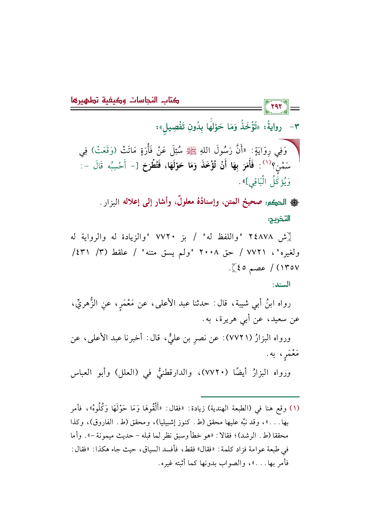 (¬١) وقع هنا في (الطبعة الهندية) زيادة: ((فقال: ((أَلْقُوهَا وَمَا حَوْلَهَا وَكُلُوهُ))، فأمر بها ... ))، وقد نبَّه عليها محقق (ط. كنوز إشبيليا)، ومحقق (ط. الفاروق)، وكذا محققا (ط. الرشد)؛ فقالا: ((هو خطأ وسبق نظر لما قبله -حديث ميمونة-)). وأما في طبعة عوامة فزاد كلمة: ((فقال)) فقط، فأفسد السياق، حيث جاء هكذا: ((فقال: فأمر بها ... ))، والصواب بدونها كما أثبته غيره.