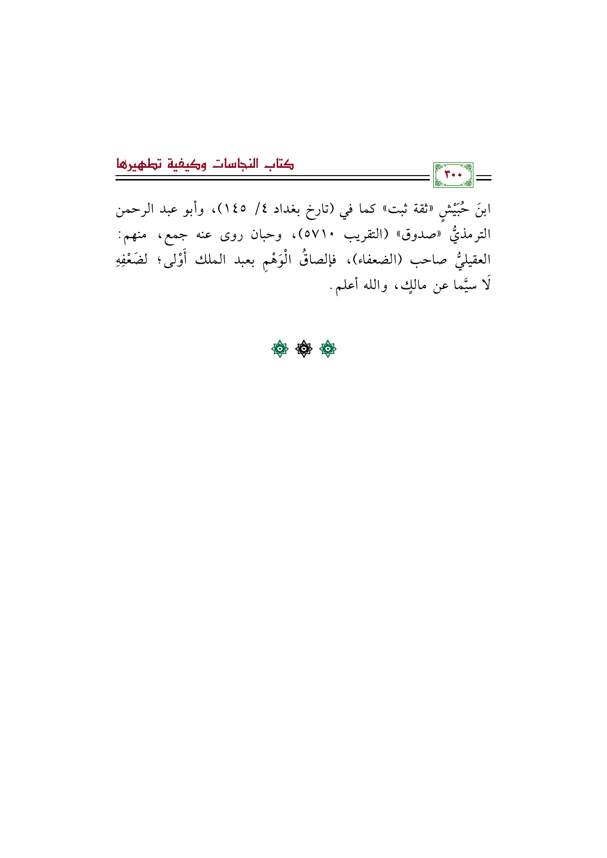 ابنَ حُبَيْشٍ ((ثقة ثبت)) كما في (تارخ بغداد ٤/ ١٤٥)، وأبو عبد الرحمن الترمذيُّ ((صدوق)) (التقريب ٥٧١٠)، وحبان روى عنه جمع، منهم: العقيليُّ صاحب (الضعفاء)، فإلصاقُ الْوَهْمِ بعبد الملك أَوْلى؛ لضَعْفِهِ لَا سيَّما عن مالكٍ، والله أعلم.