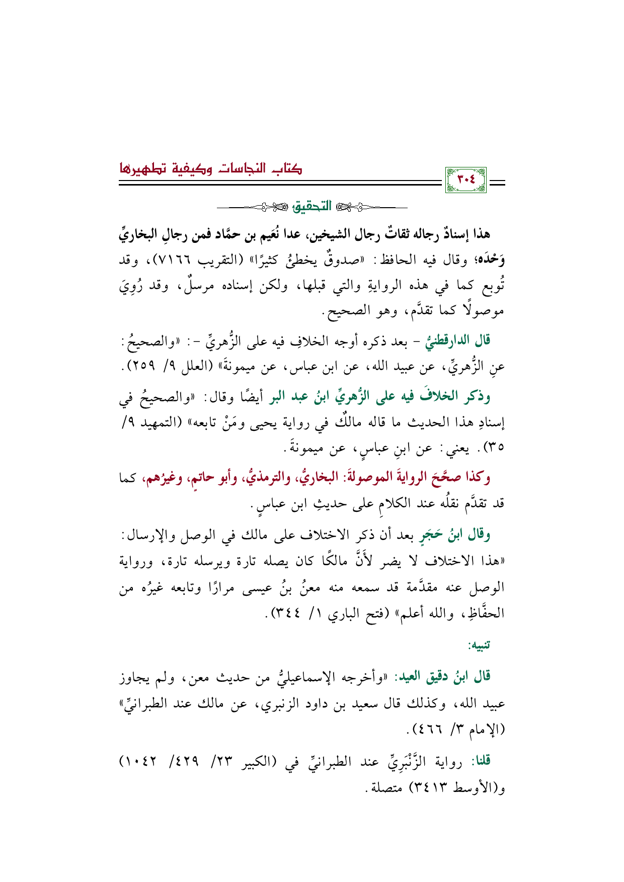 وذكر الخلافَ فيه على الزُّهريِّ ابنُ عبد البر أيضًا وقال: ((والصحيحُ في إسنادِ هذا الحديث ما قاله مالكٌ في رواية يحيى ومَنْ تابعه)) (التمهيد ٩/ ٣٥). يعني: عن ابنِ عباسٍ، عن ميمونةَ.
