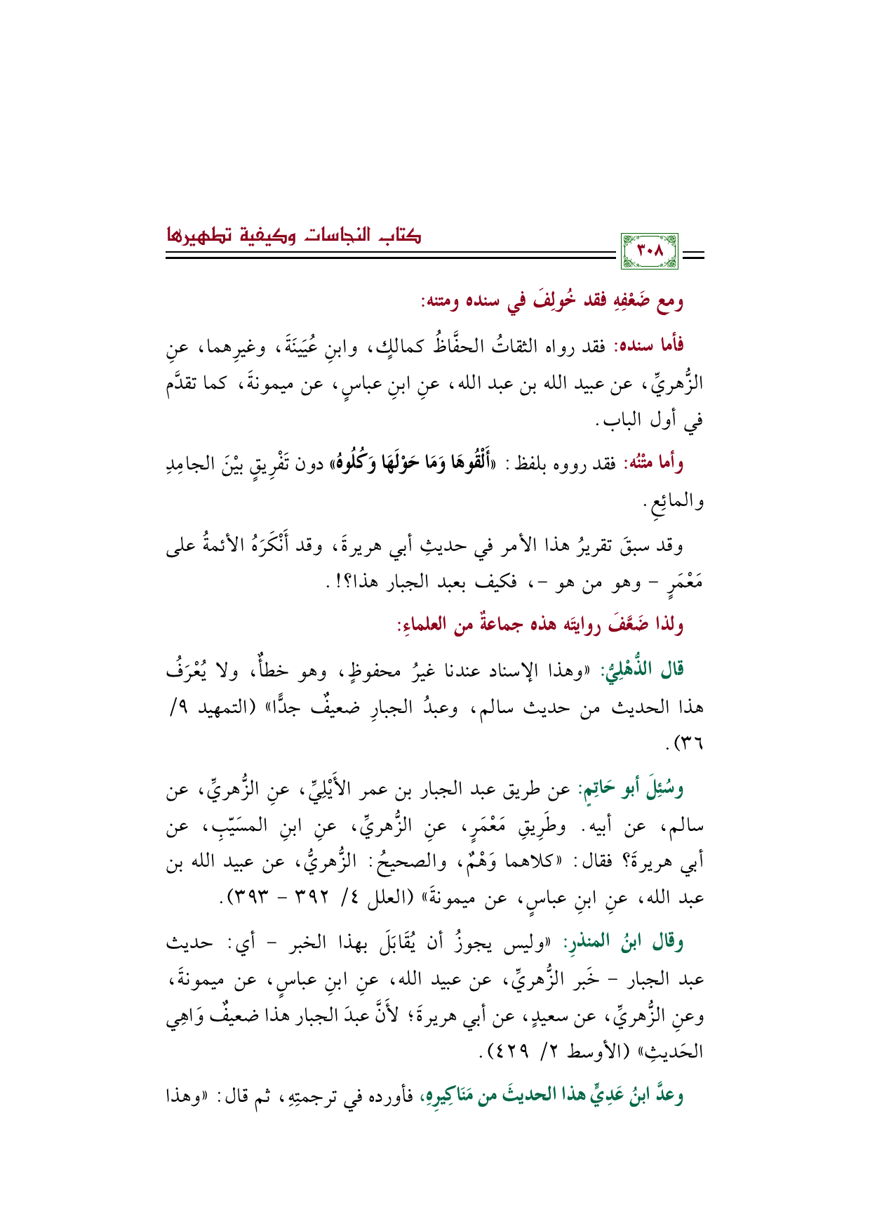 وقال ابنُ المنذرِ: ((وليس يجوزُ أن يُقَابَلَ بهذا الخبر -أي: حديث عبد الجبار- خَبر الزُّهريِّ، عن عبيد الله، عنِ ابنِ عباسٍ، عن ميمونةَ، وعنِ الزُّهريِّ، عن سعيدٍ، عن أبي هريرةَ؛ لأَنَّ عبدَ الجبار هذا ضعيفٌ وَاهِي الحَديثِ)) (الأوسط ٢/ ٤٢٩).