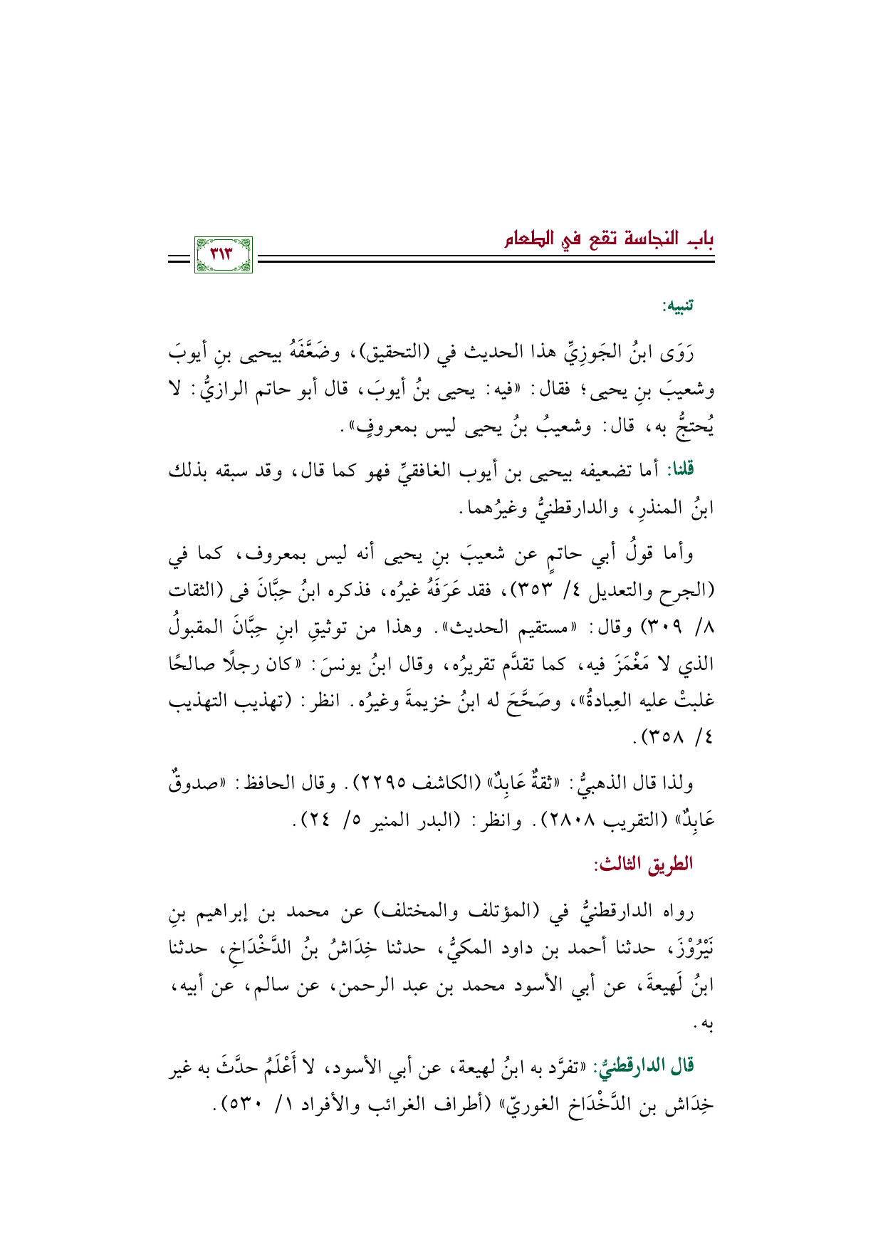 وأما قولُ أبي حاتمٍ عن شعيبَ بنِ يحيى أنه ليس بمعروف، كما في (الجرح والتعديل ٤/ ٣٥٣)، فقد عَرَفَهُ غيرُه، فذكره ابنُ حِبَّانَ فى (الثقات ٨/ ٣٠٩) وقال: ((مستقيم الحديث)). وهذا من توثيقِ ابنِ حِبَّانَ المقبولُ الذي لا مَغْمَزَ فيه، كما تقدَّم تقريرُه، وقال ابنُ يونسَ: ((كان رجلًا صالحًا غلبتْ عليه العِبادةُ))، وصَحَّحَ له ابنُ خزيمةَ وغيرُه. انظر: (تهذيب التهذيب ٤/ ٣٥٨).