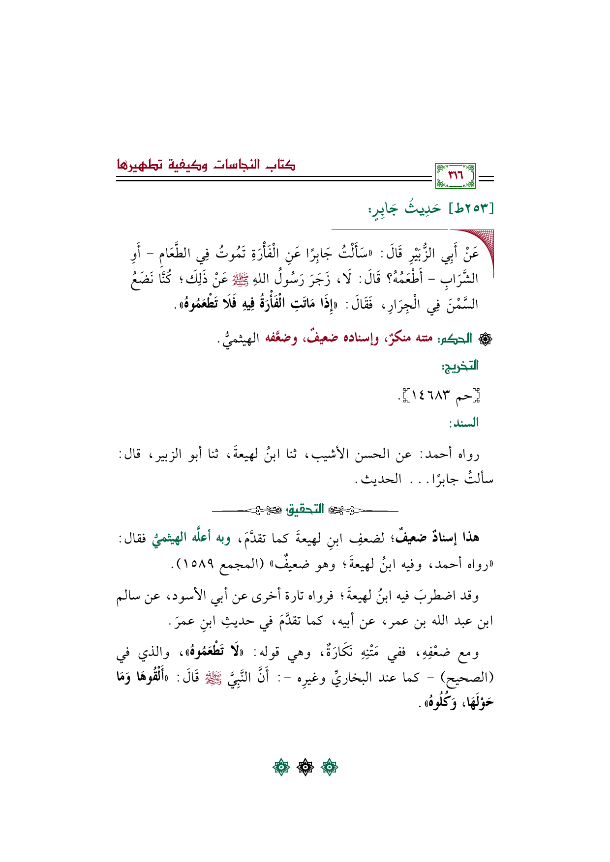 ومع ضعْفِهِ، ففي مَتْنِهِ نَكَارَةٌ، وهي قوله: ((لَا تَطْعَمُوهُ))، والذي في (الصحيح) -كما عند البخاريِّ وغيرِه-: أَنَّ النَّبِيَّ صلى الله عليه وسلم قَالَ: ((أَلْقُوهَا وَمَا حَوْلَهَا، وَكُلُوهُ)).