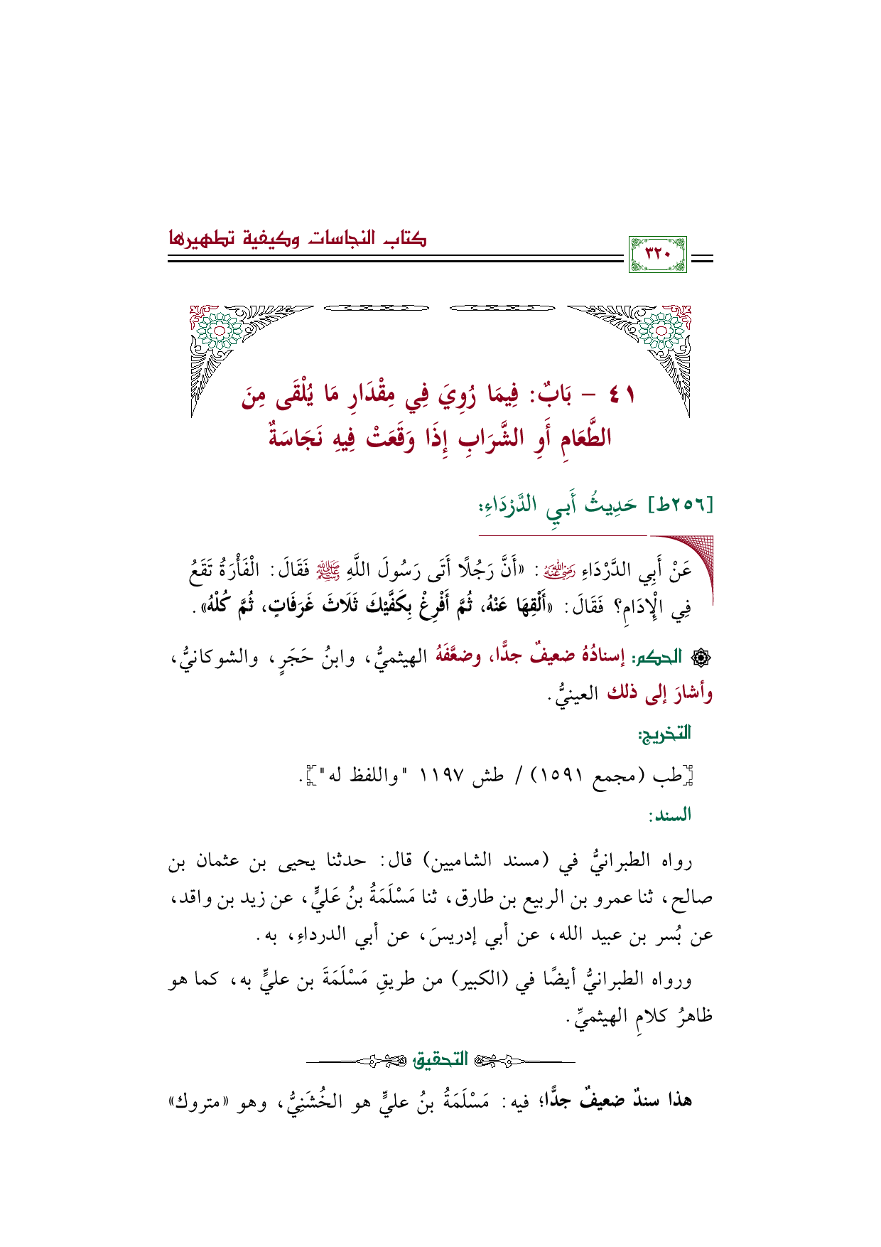 رواه الطبرانيُّ في (مسند الشاميين) قال: حدثنا يحيى بن عثمان بن صالح، ثنا عمرو بن الربيع بن طارق، ثنا مَسْلَمَةُ بنُ عَليٍّ، عن زيد بن واقد، عن بُسر بن عبيد الله، عن أبي إدريسَ، عن أبي الدرداءِ، به.