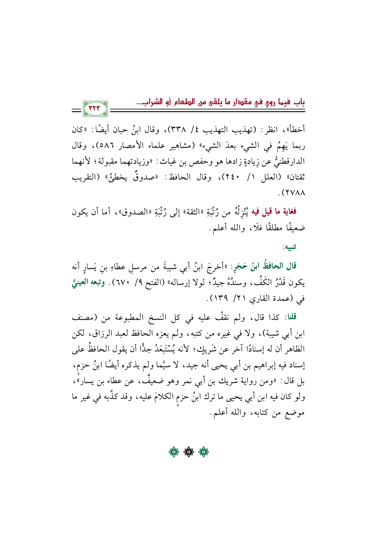 قلنا: كذا قال، ولم نقفْ عليه في كل النسخ المطبوعة من (مصنف ابن أبي شيبة)، ولا في غيره من كتبه، ولم يعزه الحافظ لعبد الرزاق، لكن الظاهر أن له إسنادًا آخر عن شَريكٍ؛ لأنه يُسْتَبعَدُ جدًّا أن يقول الحافظُ على إسناد فيه إبراهيم بن أبي يحيى أنه جيد، لا سيَّما ولم يذكره أيضًا ابنُ حزمٍ، بل قال: ((ومن رواية شريك بن أبي نمر وهو ضعيفٌ، عن عطاء بن يسار))، ولو كان فيه ابن أبي يحيى ما ترك ابنُ حزمٍ الكلامَ عليه، وقد كذَّبه في غير ما موضع من كتابه، والله أعلم.