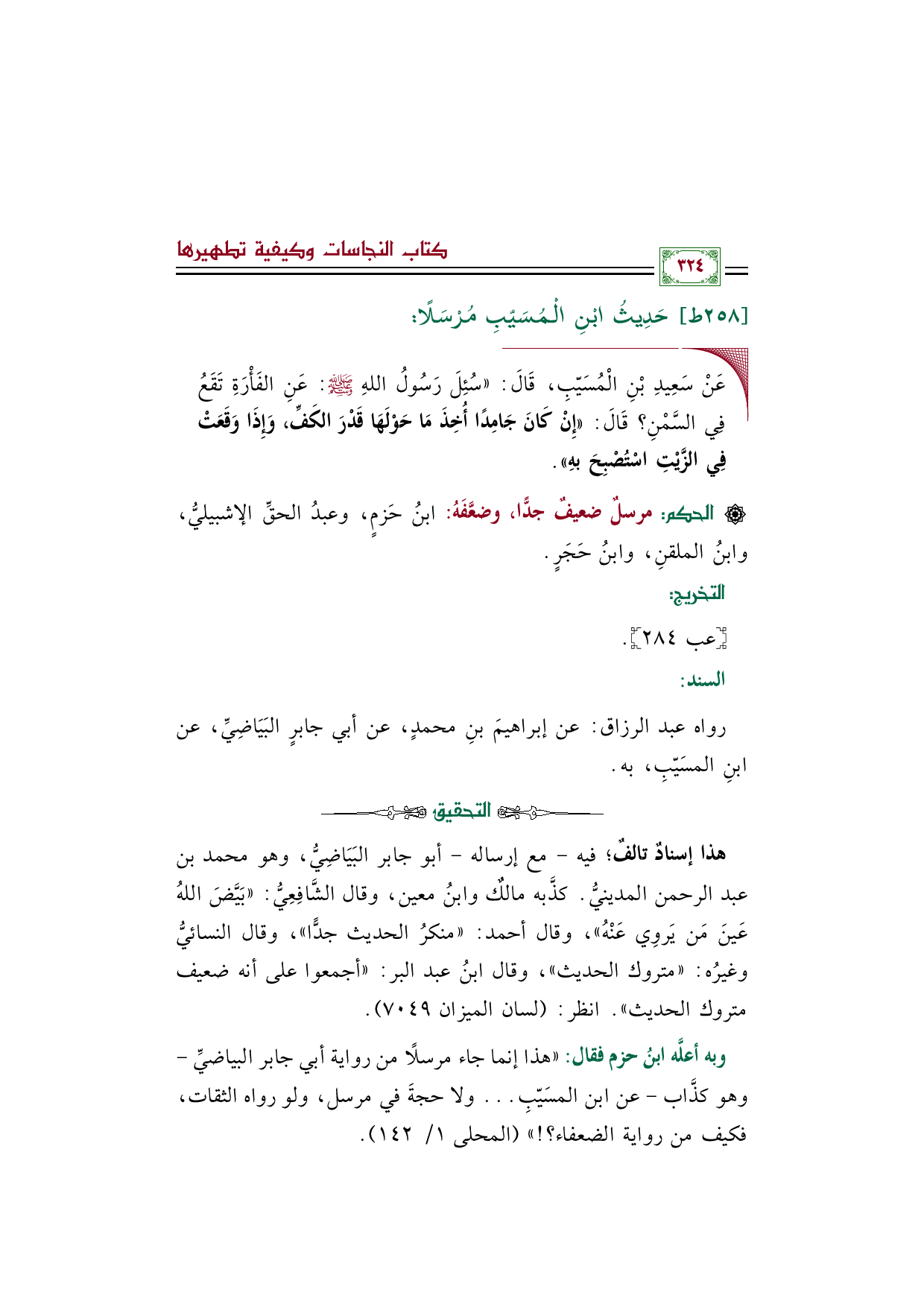 وبه أعلَّه ابنُ حزم فقال: ((هذا إنما جاء مرسلًا من رواية أبي جابر البياضيِّ -وهو كذَّاب- عن ابن المسَيّبِ ... ولا حجةَ في مرسل، ولو رواه الثقات، فكيف من رواية الضعفاء؟ ! )) (المحلى ١/ ١٤٢).