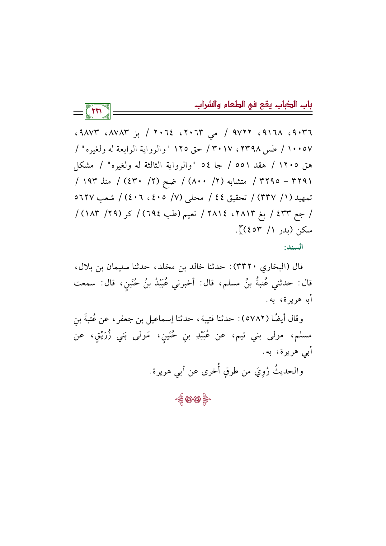 قال (البخاري ٣٣٢٠): حدثنا خالد بن مخلد، حدثنا سليمان بن بلال، قال: حدثني عُتبةُ بنُ مسلم، قال: أخبرني عُبَيْدُ بنُ حُنَينٍ، قال: سمعت أبا هريرة، به.