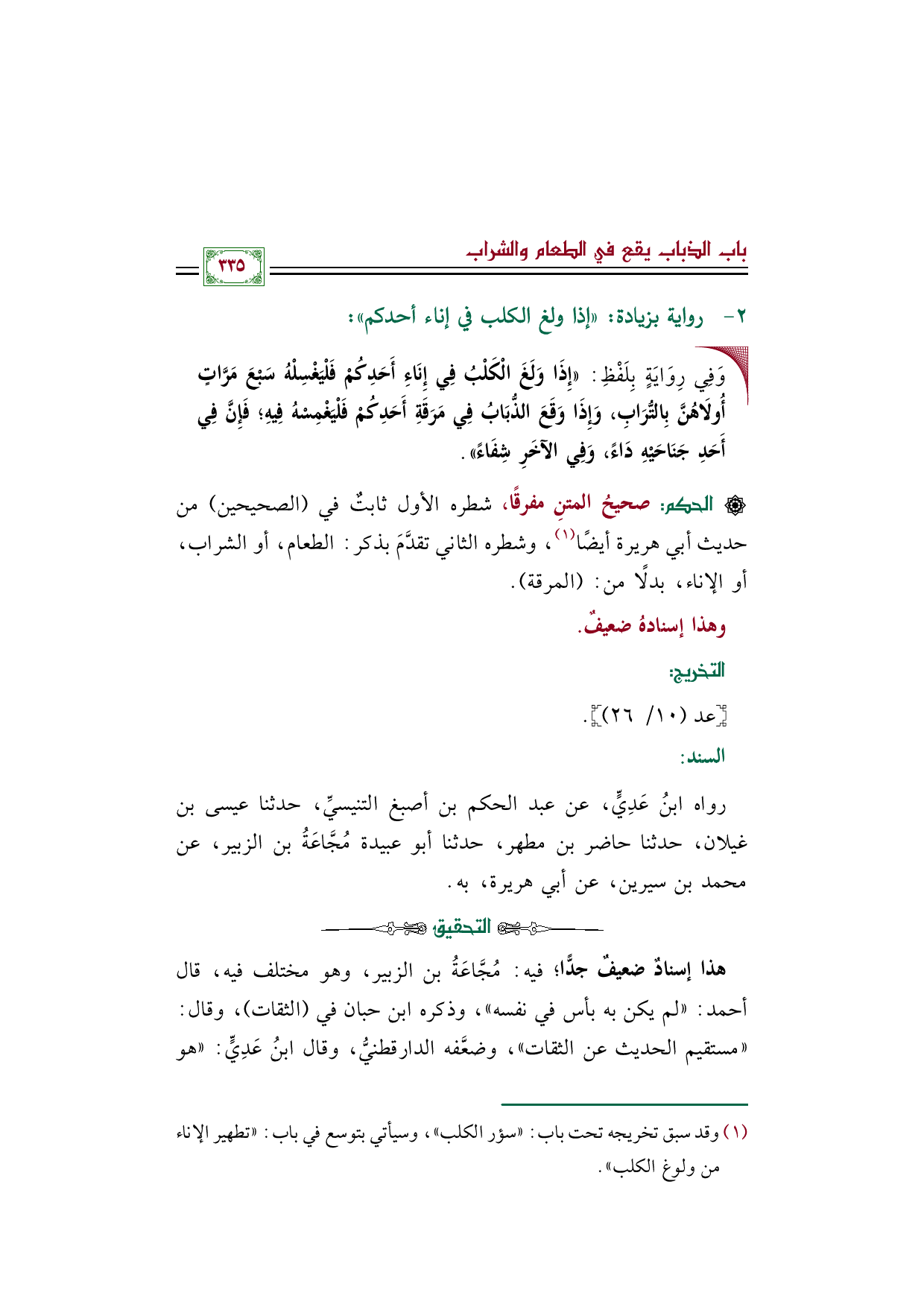 (¬١) وقد سبق تخريجه تحت باب: ((سؤر الكلب))، وسيأتي بتوسع في باب: ((تطهير الإناء من ولوغ الكلب)).