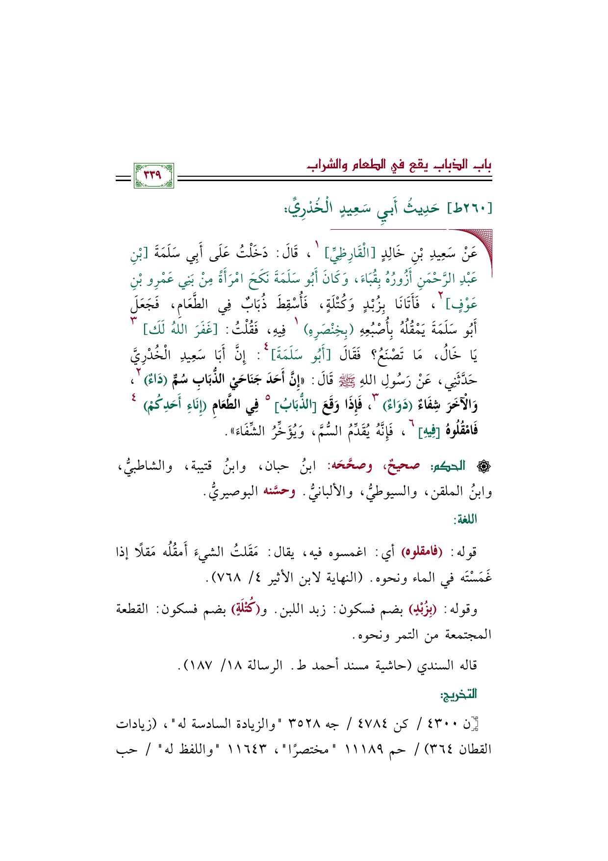◼ عَنْ سَعِيدِ بْنِ خَالِدٍ [الْقَارِظِيِّ] ١، قَالَ: دَخَلْتُ عَلَى أَبِي سَلَمَةَ [بْنِ عَبْدِ الرَّحْمَنِ أَزُورُهُ بِقُبَاءَ، وَكَانَ أَبُو سَلَمَةَ نَكَحَ امْرَأَةً مِنْ بَنِي عَمْرِو بْنِ عَوْفٍ] ٢، فَأَتَانَا بِزُبْدٍ وَكُتْلَةٍ، فَأُسْقِطَ ذُبَابٌ فِي الطَّعَامِ، فَجَعَلَ أَبُو سَلَمَةَ يَمْقُلُهُ بِأُصْبُعِهِ (بِخِنْصَرِهِ) ١ فِيهِ، فَقُلْتُ: [غَفَرَ اللهُ لَكَ] ٣ يَا خَالُ، مَا تَصْنَعُ؟ فَقَالَ [أَبُو سَلَمَةَ] ٤: إِنَّ أَبَا سَعِيدِ الْخُدْرِيَّ حَدَّثَنِي، عَنْ رَسُولِ اللهِ صلى الله عليه وسلم قَالَ: ((إِنَّ أَحَدَ جَنَاحَيْ الذُّبَابِ سُمٌّ (دَاءٌ) ٢، وَالْآخَرَ شِفَاءٌ (دَوَاءٌ) ٣، فَإِذَا وَقَعَ [الذُّبَابُ] ٥ فِي الطَّعَامِ (إِنَاءِ أَحَدِكُمْ) ٤ فَامْقُلُوهُ [فِيهِ] ٦، فَإِنَّهُ يُقَدِّمُ السُّمَّ، وَيُؤَخِّرُ الشِّفَاءَ)).