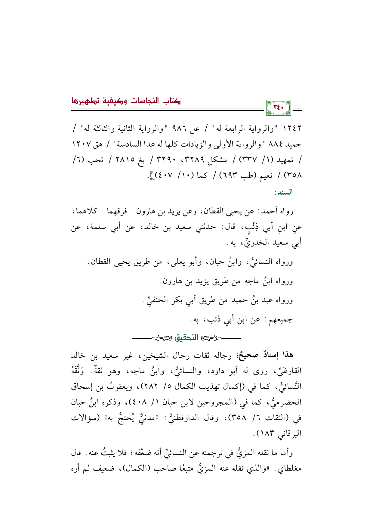 رواه (أحمد): عن يحيى القطان، وعن يزيد بن هارون -فرقهما- كلاهما، عنِ ابنِ أبي ذِئْبٍ، قال: حدثني سعيد بن خالد، عن أبي سلمة، عن أبي سعيد الخدريِّ، به.