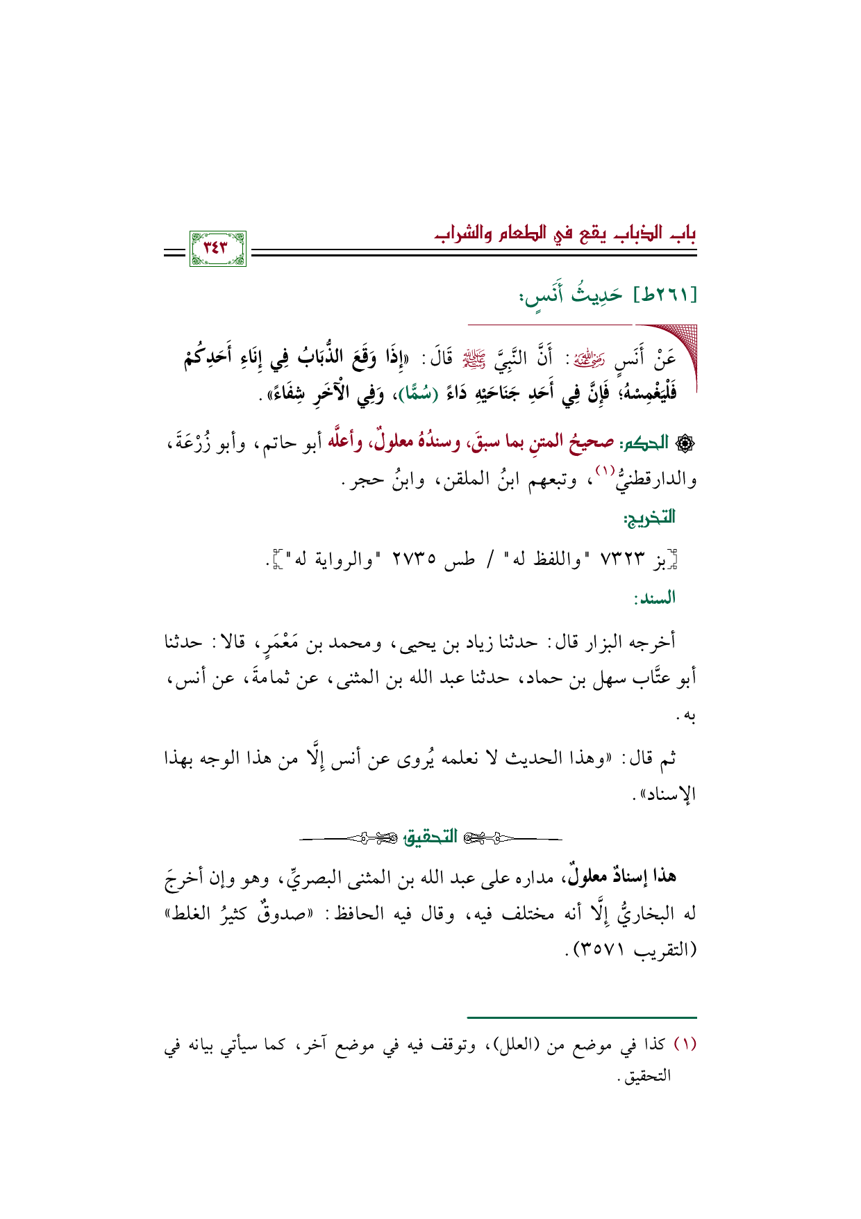 هذا إسنادٌ معلولٌ، مداره على عبد الله بن المثنى البصريِّ، وهو وإن أخرجَ له البخاريُّ إِلَّا أنه مختلف فيه، وقال فيه الحافظ: ((صدوقٌ كثيرُ الغلط)) (التقريب ٣٥٧١).