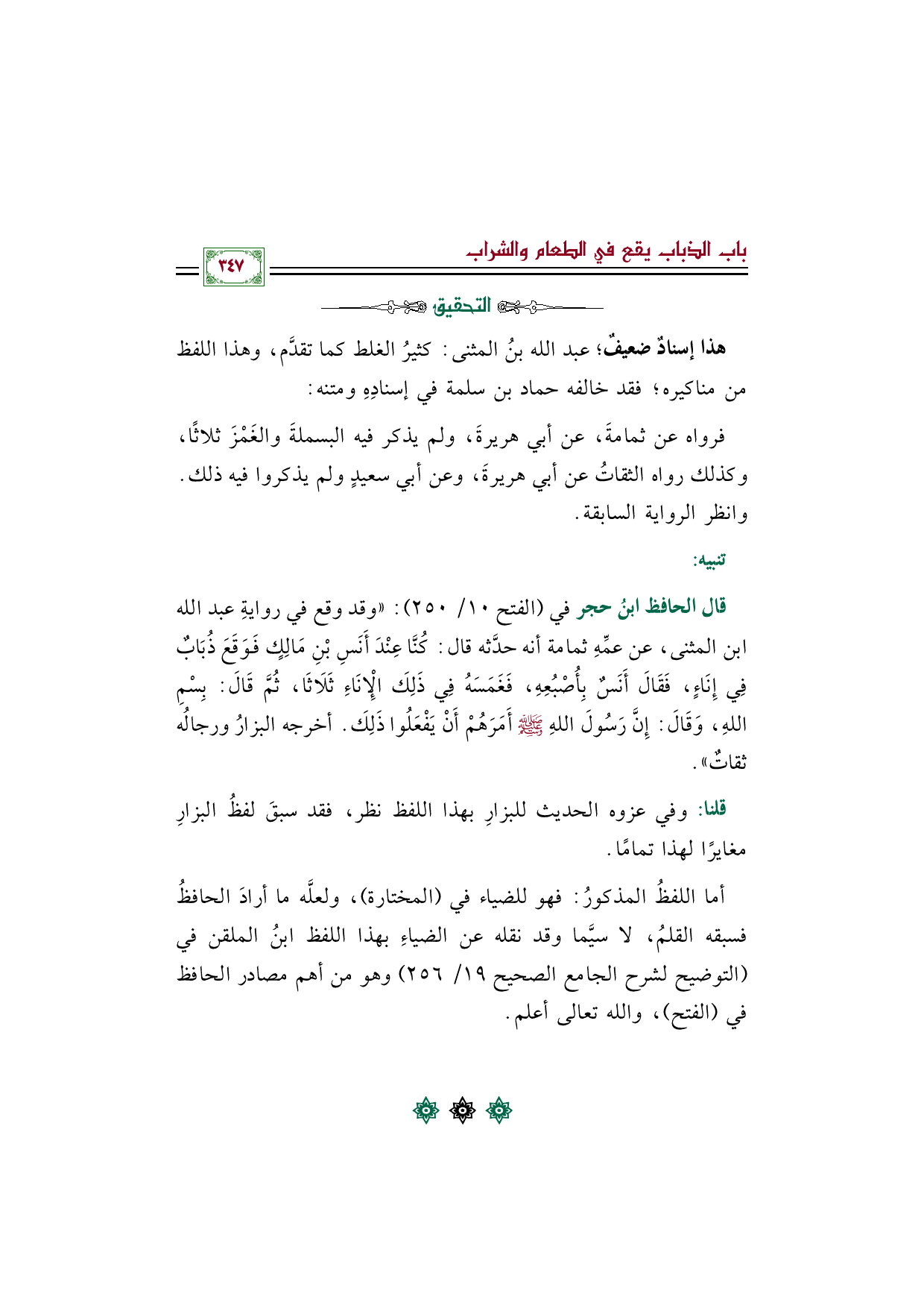 قال الحافظ ابنُ حجر في (الفتح ١٠/ ٢٥٠): ((وقد وقع في روايةِ عبد الله بن المثنى، عن عمِّهِ ثمامة أنه حدَّثه قال: كُنَّا عِنْدَ أَنَسِ بْنِ مَالِكٍ فَوَقَعَ ذُبَابٌ فِي إِنَاءٍ، فَقَالَ أَنَسٌ بِأُصْبُعِهِ، فَغَمَسَهُ فِي ذَلِكَ الْإِنَاءِ ثَلَاثَا، ثُمَّ قَالَ: بِسْمِ اللهِ، وَقَالَ: إِنَّ رَسُولَ اللهِ صلى الله عليه وسلم أَمَرَهُمْ أَنْ يَفْعَلُوا ذَلِكَ. أخرجه البزارُ ورجالُه ثقاتٌ)).