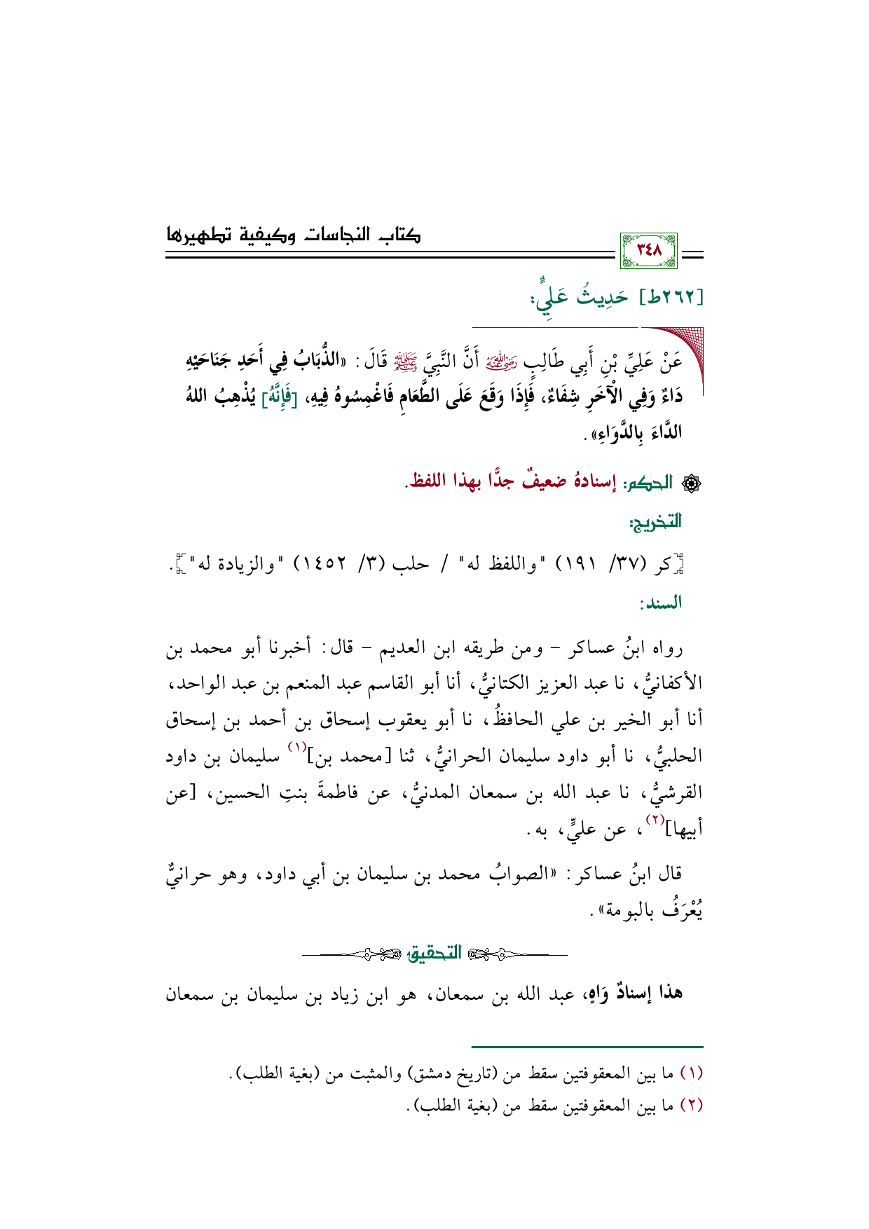 رواه ابنُ عساكر -ومن طريقه ابن العديم- قال: أخبرنا أبو محمد بن الأكفانيُّ، نا عبد العزيز الكتانيُّ، أنا أبو القاسم عبد المنعم بن عبد الواحد، أنا أبو الخير بن علي الحافظُ، نا أبو يعقوب إسحاق بن أحمد بن إسحاق الحلبيُّ، نا أبو داود سليمان الحرانيُّ، ثنا [محمد بن] (¬١) سليمان بن داود القرشيُّ، نا عبد الله بن سمعان المدنيُّ، عن فاطمةَ بنتِ الحسين، [عن أبيها] (¬٢)، عن عليٍّ، به.