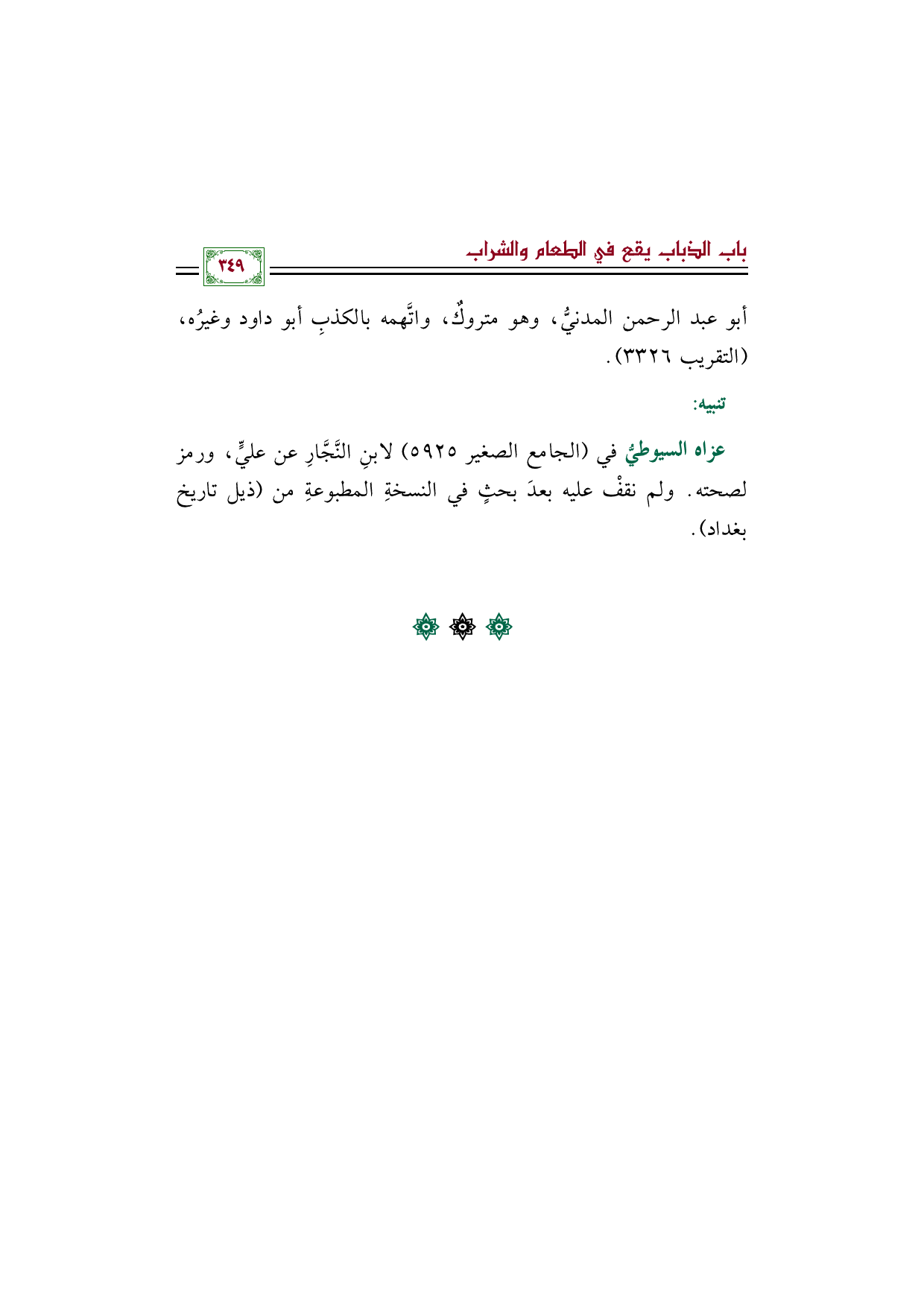 عزاه السيوطيُّ في (الجامع الصغير ٥٩٢٥) لابنِ النَّجَّارِ عن عليٍّ، ورمز لصحته. ولم نقفْ عليه بعدَ بحثٍ في النسخةِ المطبوعةِ من ((ذيل تاريخ بغداد)).