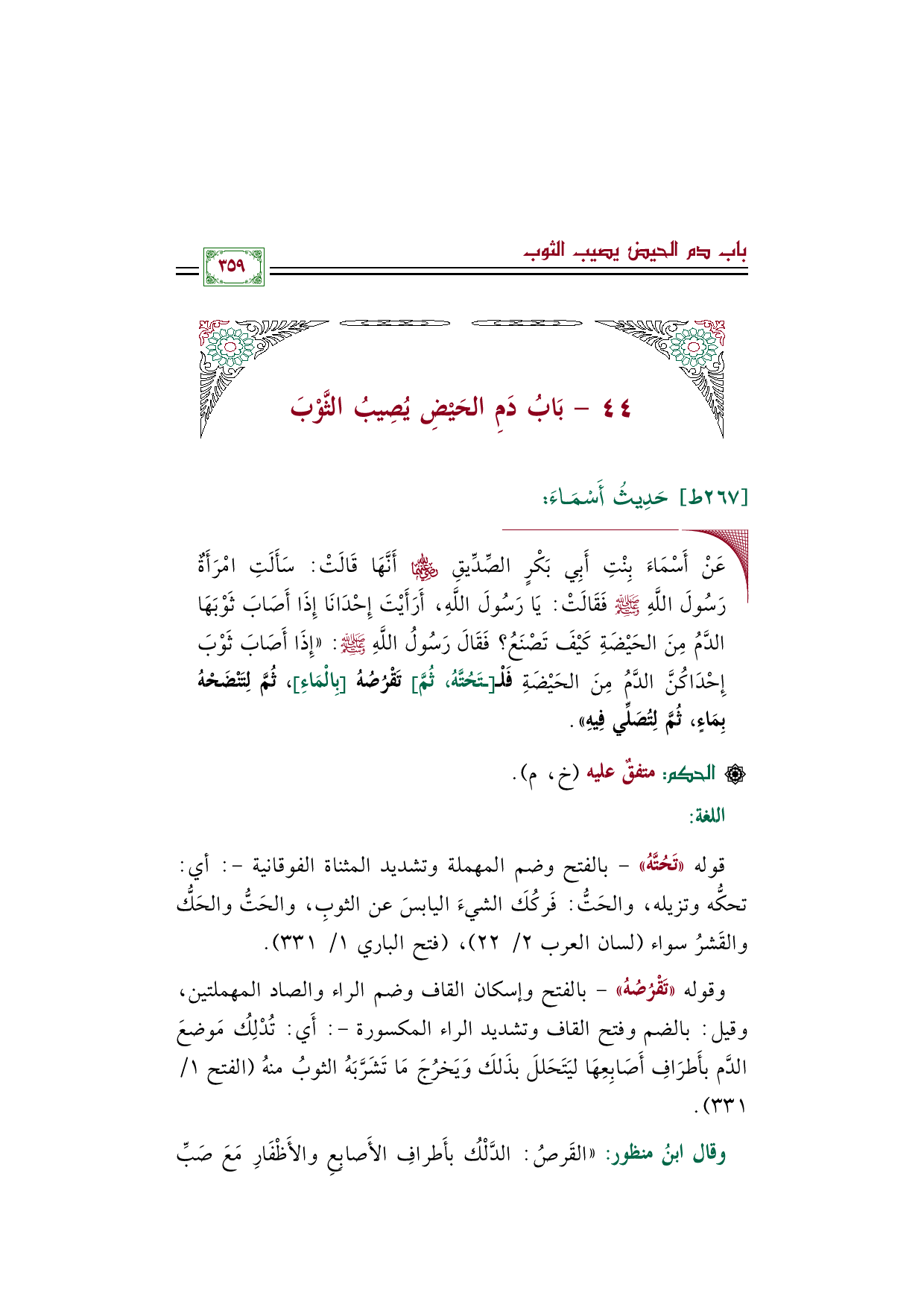 ◼ عَنْ أَسْمَاءَ بِنْتِ أَبِي بَكْرٍ الصِّدِّيقِ رضي الله عنهما أَنَّهَا قَالَتْ: سَأَلَتِ امْرَأَةٌ رَسُولَ اللَّهِ صلى الله عليه وسلم فَقَالَتْ: يَا رَسُولَ اللَّهِ، أَرَأَيْتَ إِحْدَانَا إِذَا أَصَابَ ثَوْبَهَا الدَّمُ مِنَ الحَيْضَةِ كَيْفَ تَصْنَعُ؟ فَقَالَ رَسُولُ اللَّهِ صلى الله عليه وسلم: ((إِذَا أَصَابَ ثَوْبَ إِحْدَاكُنَّ الدَّمُ مِنَ الحَيْضَةِ فَلْـ[ـتَحُتَّهُ، ثُمَّ] تَقْرُصُهُ [بِالْمَاءِ]، ثُمَّ لِتَنْضَحْهُ بِمَاءٍ، ثُمَّ لِتُصَلِّي فِيهِ)).