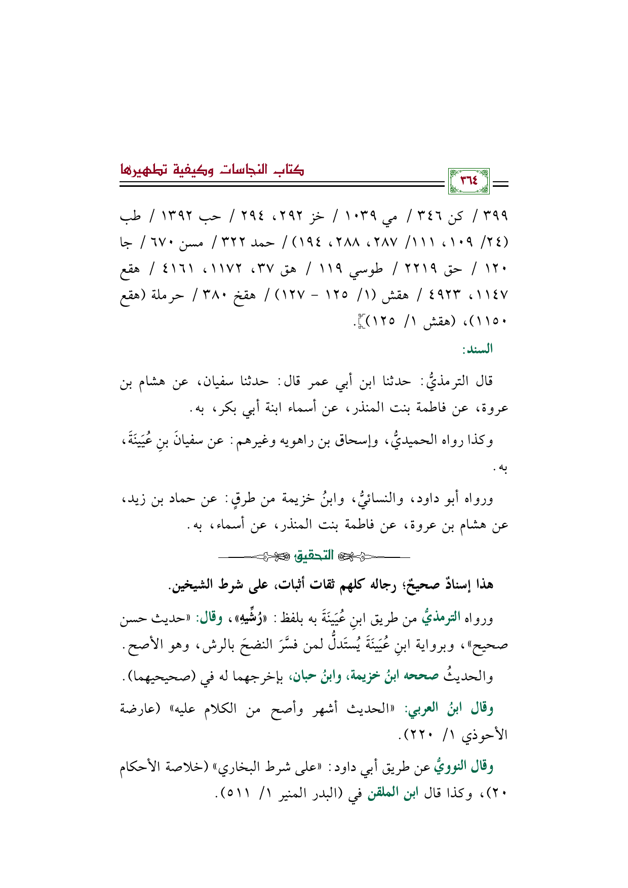 قال الترمذيُّ: حدثنا ابن أبي عمر قال: حدثنا سفيان، عن هشام بن عروة، عن فاطمة بنت المنذر، عن أسماء ابنة أبي بكر، به.