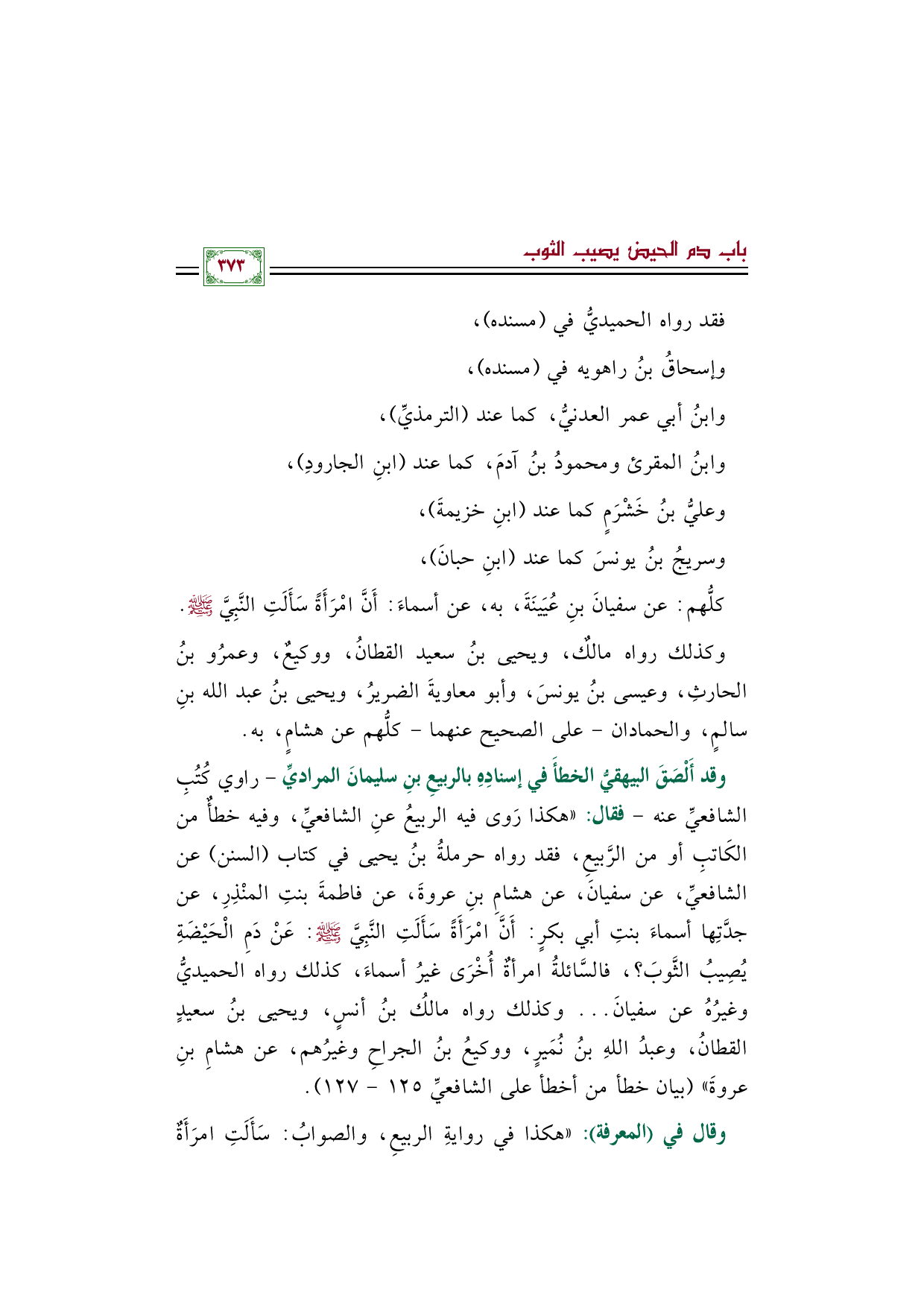 وقد أَلْصَقَ البيهقيُّ الخطأَ في إسنادِهِ بالربيعِ بنِ سليمانَ المراديِّ -راوي كُتُبِ الشافعيِّ عنه- فقال: ((هكذا رَوى فيه الربيعُ عنِ الشافعيِّ، وفيه خطأٌ من الكَاتبِ أو من الرَّبيعِ، فقد رواه حرملةُ بنُ يحيى في كتاب (السنن) عن الشافعيِّ، عن سفيانَ، عن هشامِ بنِ عروةَ، عن فاطمةَ بنتِ المنْذِرِ، عن جدَّتِها أسماءَ بنتِ أبي بكرٍ: أَنَّ امْرَأَةً سَأَلَتِ النَّبِيَّ صلى الله عليه وسلم: عَنْ دَمِ الْحَيْضَةِ يُصِيبُ الثَّوبَ؟ ، فالسَّائلةُ امرأةٌ أُخْرَى غيرُ أسماءَ، كذلك رواه الحميديُّ وغيرُهُ عن سفيانَ ... وكذلك رواه مالكُ بنُ أنسٍ، ويحيى بنُ سعيدٍ القطانُ، وعبدُ اللهِ بنُ نُمَيرٍ، ووكيعُ بنُ الجراحِ وغيرُهم، عن هشامِ بنِ عروةَ)) (بيان خطأ من أخطأ على الشافعيِّ ١٢٥ - ١٢٧).