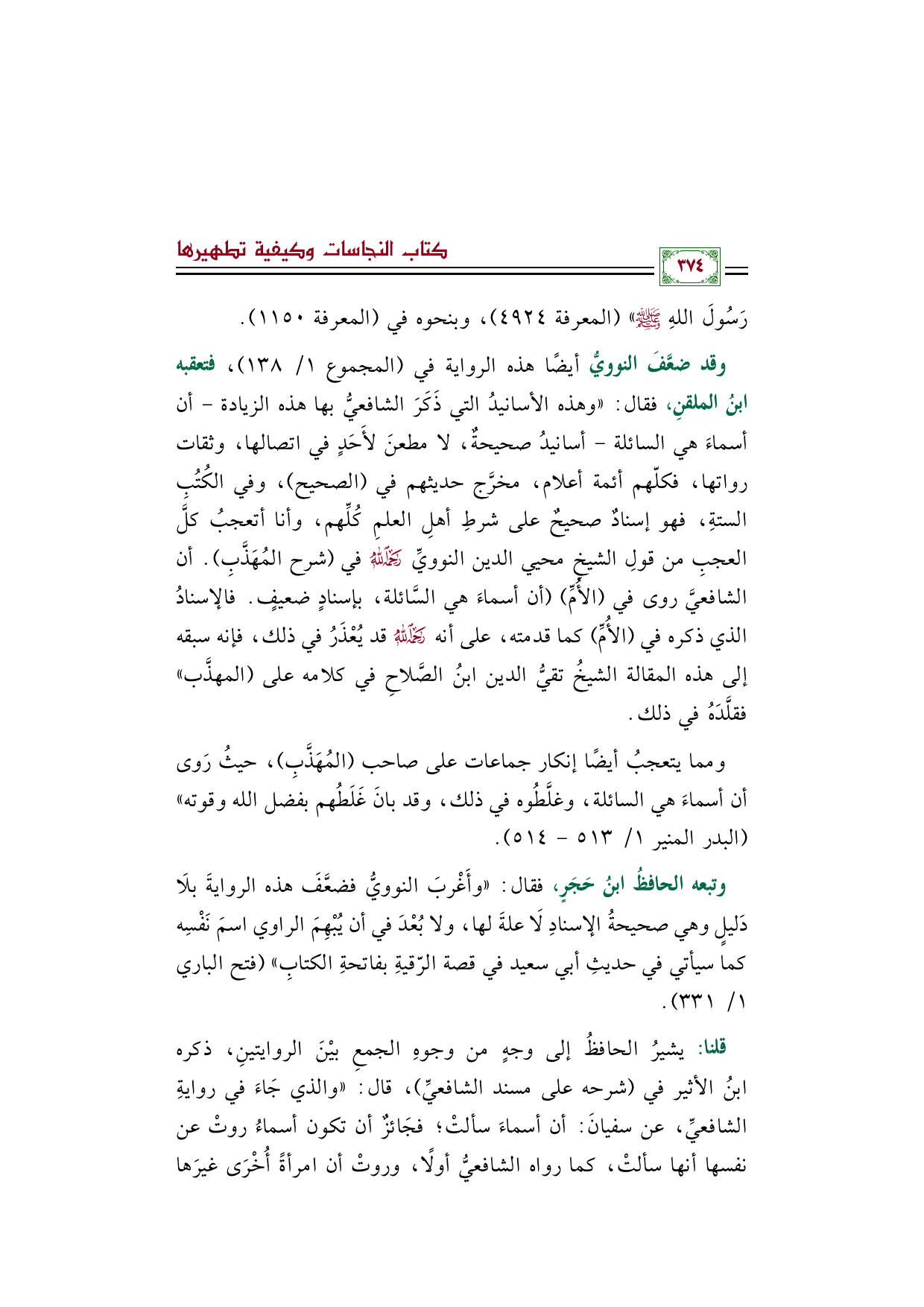 وقد ضعَّفَ النوويُّ أيضًا هذه الرواية في (المجموع ١/ ١٣٨)، فتعقبه ابنُ الملقنِ، فقال: ((وهذه الأسانيدُ التي ذَكَرَ الشافعيُّ بها هذه الزيادة -أن أسماءَ هي السائلة- أسانيدُ صحيحةٌ، لا مطعنَ لأَحَدٍ في اتصالها، وثقات رواتها، فكلّهم أئمة أعلام، مخرَّج حديثهم في (الصحيح)، وفي الكُتُبِ الستةِ، فهو إسنادٌ صحيحٌ على شرطِ أهلِ العلمِ كُلِّهم، وأنا أتعجبُ كلَّ العجبِ من قولِ الشيخِ محيي الدين النوويِّ رحمه الله في (شرح المُهَذَّبِ). أن الشافعيَّ روى في (الأُمِّ) (أن أسماءَ هي السَّائلة، بإسنادٍ ضعيفٍ. فالإسنادُ الذي ذكره في (الأُمِّ) كما قدمته، على أنه رحمه الله قد يُعْذَرُ في ذلك، فإنه سبقه إلى هذه المقالة الشيخُ تقيُّ الدين ابنُ الصَّلاحِ في كلامه على (المهذَّب)) فقلَّدَهُ في ذلك.