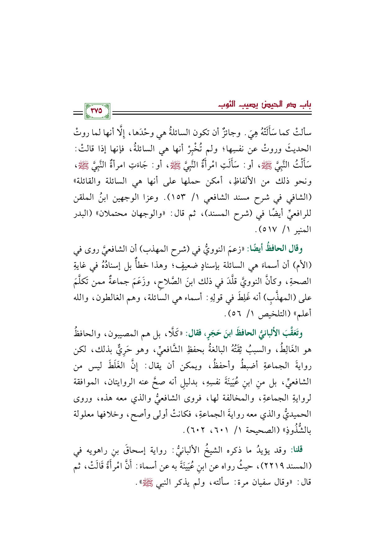 وقال الحافظُ أيضًا: ((زعمَ النوويُّ في (شرح المهذب) أن الشافعيَّ روى في (الأم) أن أسماءَ هي السائلة بإسنادٍ ضعيفٍ؛ وهذا خطأٌ بل إسنادُهُ في غايةِ الصحةِ، وكأنَّ النوويَّ قلَّدَ في ذلك ابنَ الصَّلاحِ، وزَعَمَ جماعةٌ ممن تَكلَّمَ على (المهذَّبِ) أنه غَلِطَ في قولِهِ: أسماء هي السائلة، وهم الغالطون، والله أعلم)) (التلخيص ١/ ٥٦).