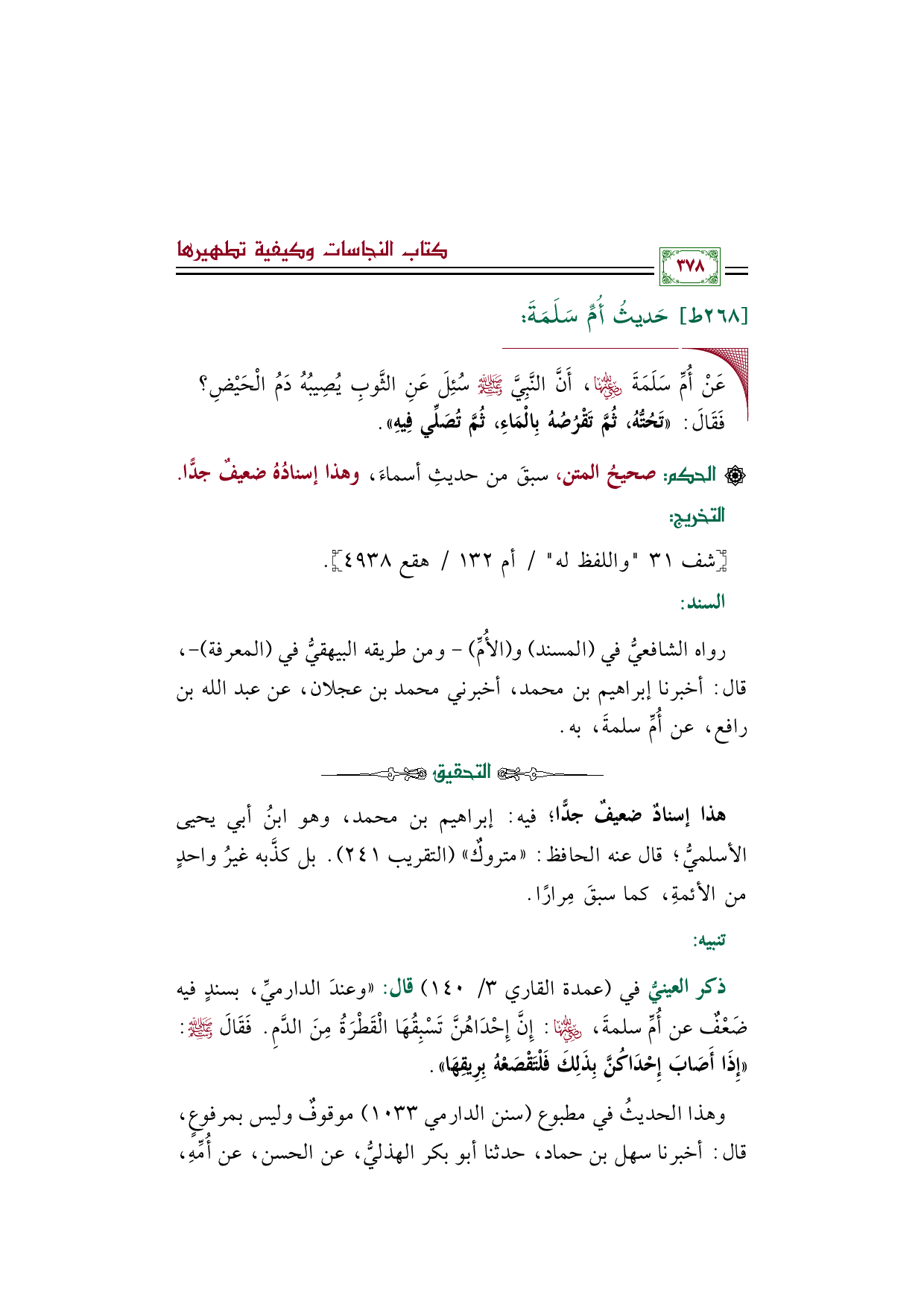 ◼ عَنْ أُمِّ سَلَمَةَ رضي الله عنها، أَنَّ النَّبِيَّ صلى الله عليه وسلم سُئِلَ عَنِ الثَّوبِ يُصِيبُهُ دَمُ الْحَيْضِ؟ فَقَالَ: ((تَحُتُّهُ، ثُمَّ تَقْرُصُهُ بِالْمَاءِ، ثُمَّ تُصَلِّي فِيهِ)).