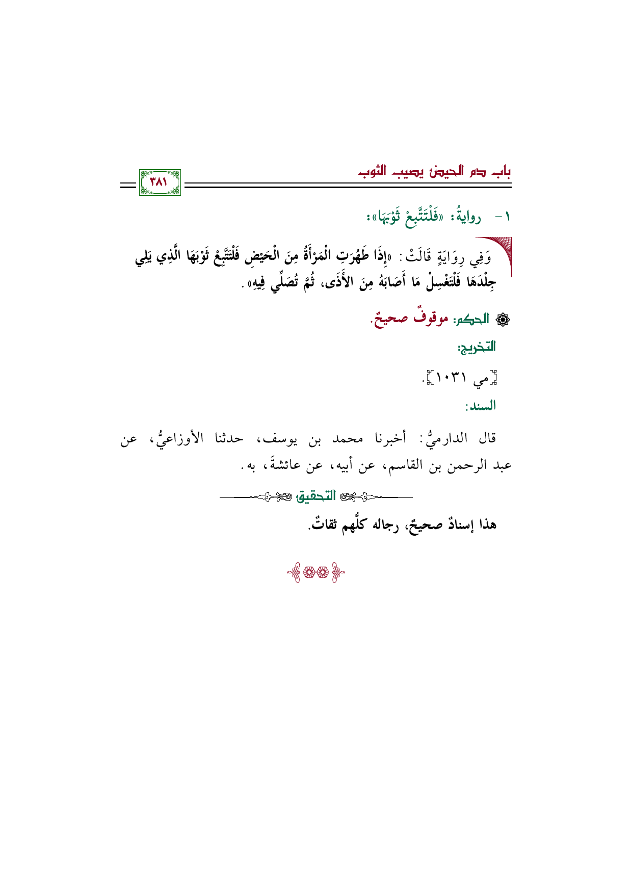 قال الدارميُّ: أخبرنا محمد بن يوسف، حدثنا الأوزاعيُّ، عن عبد الرحمن بن القاسم، عن أبيه، عن عائشةَ، به.