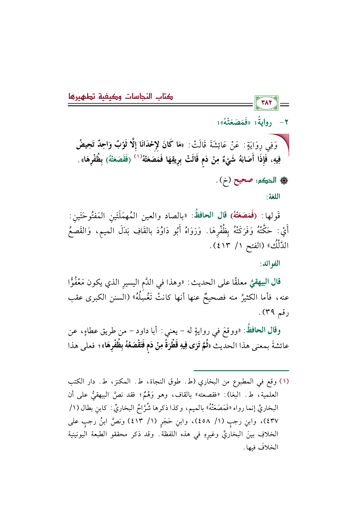(¬١) وقع في المطبوع من البخاري (ط. طوق النجاة، ط. المكنز، ط. دار الكتب العلمية، ط. البغا): ((فقصعته)) بالقاف، وهو وَهْمٌ؛ فقد نصَّ البيهقيُّ على أن البخاريَّ إنما رواه ((فَمَصَعَتْهُ)) بالميم، وكذا ذكرها شُرَّاحُ البخاريِّ: كابنِ بطال (١/ ٤٣٧)، وابنِ رجبٍ (١/ ٤٥٨)، وابنِ حَجَرٍ (١/ ٤١٣) ونصَّ ابنُ رجبٍ على الخلافِ بينَ البخاريِّ وغيرِهِ في هذه اللفظة. وقد ذكر محققو الطبعة اليونينية الخلافَ فيها.