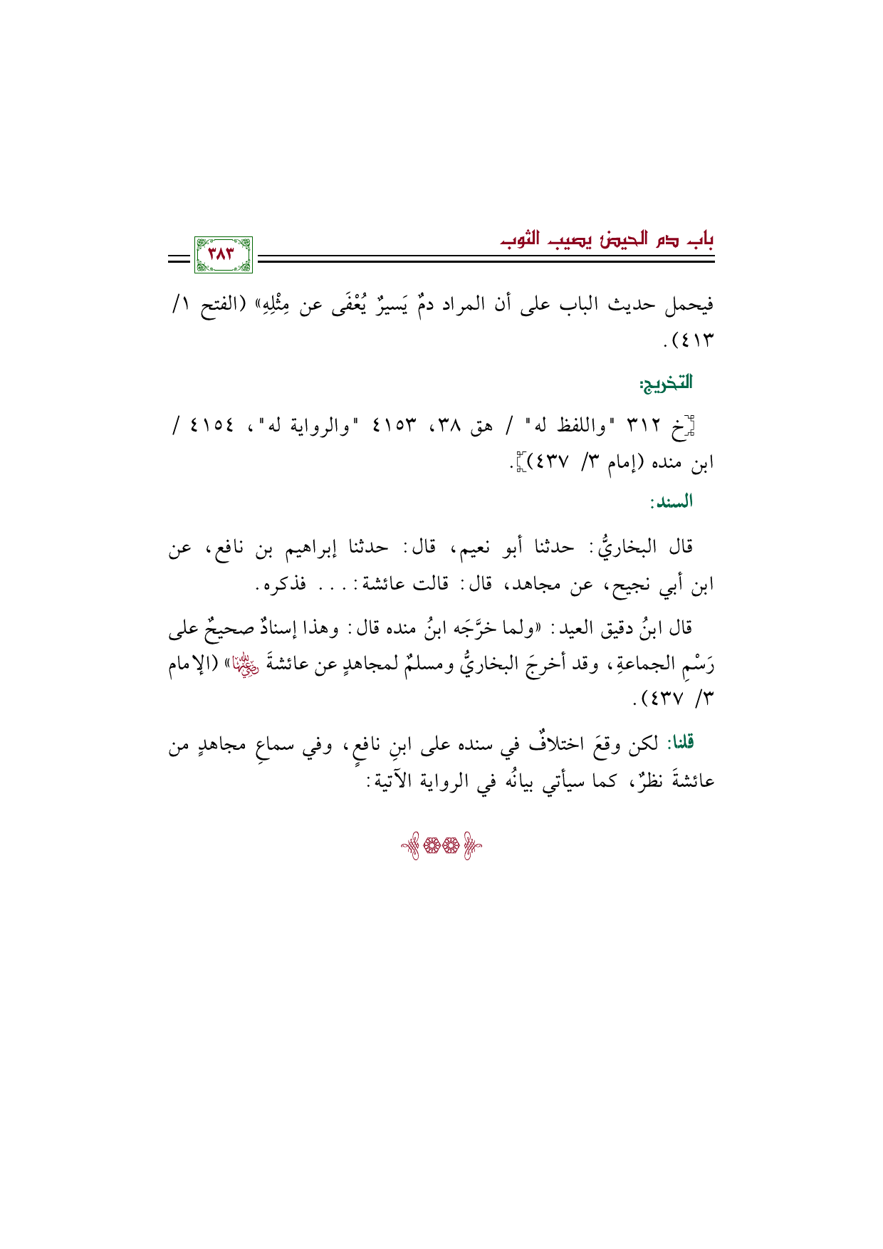 قال ابنُ دقيق العيد: ((ولما خرَّجَه ابنُ منده قال: وهذا إسنادٌ صحيحٌ على رَسْمِ الجماعةِ، وقد أخرجَ البخاريُّ ومسلمٌ لمجاهدٍ عن عائشةَ رضي الله عنها)) (الإمام ٣/ ٤٣٧).