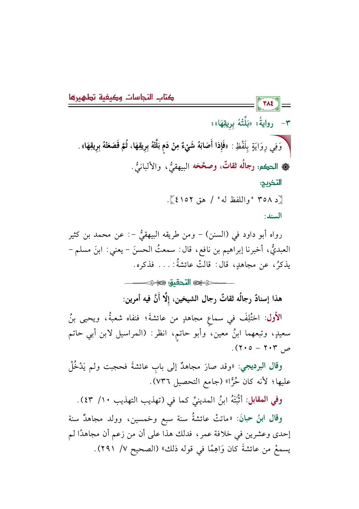 وقال البرديجي: ((وقد صارَ مجاهدٌ إلى بابِ عائشةَ فحجبت ولم يَدْخُلْ عليها؛ لأنه كان حُرًّا)) (جامع التحصيل ٧٣٦).
