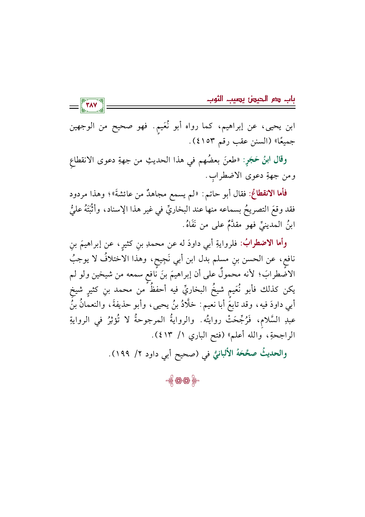 ابن يحيى، عن إبراهيم، كما رواه أبو نُعَيمٍ. فهو صحيح من الوجهين جميعًا)) (السنن عقب رقم ٤١٥٣).
