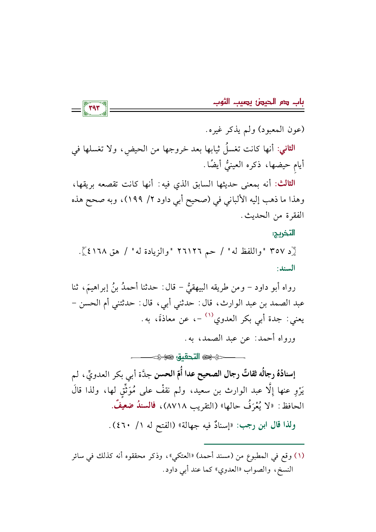 رواه أبو داود -ومن طريقه البيهقيُّ- قال: حدثنا أحمدُ بنُ إبراهيمَ، ثنا عبد الصمد بن عبد الوارث، قال: حدثني أبي، قال: حدثتني أم الحسن -يعني: جدة أبي بكر العدوي (¬١) -، عن معاذةَ، به.