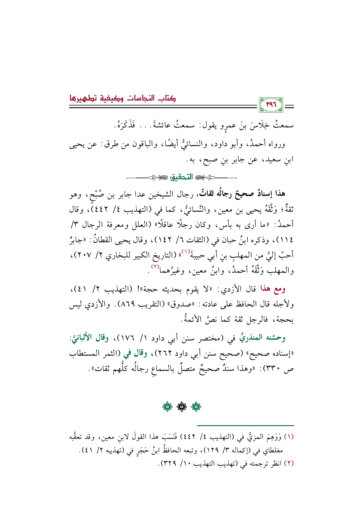 وحسَّنه المنذريُّ في (مختصر سنن أبي داود ١/ ١٧٦)، وقال الألبانيُّ: ((إسناده صحيح)) (صحيح سنن أبي داود ٢٦٢)، وقال في (الثمر المستطاب صـ ٣٣٠): ((وهذا سندٌ صحيحٌ متصلٌ بالسماعِ رجالُه كلُّهم ثقات)).