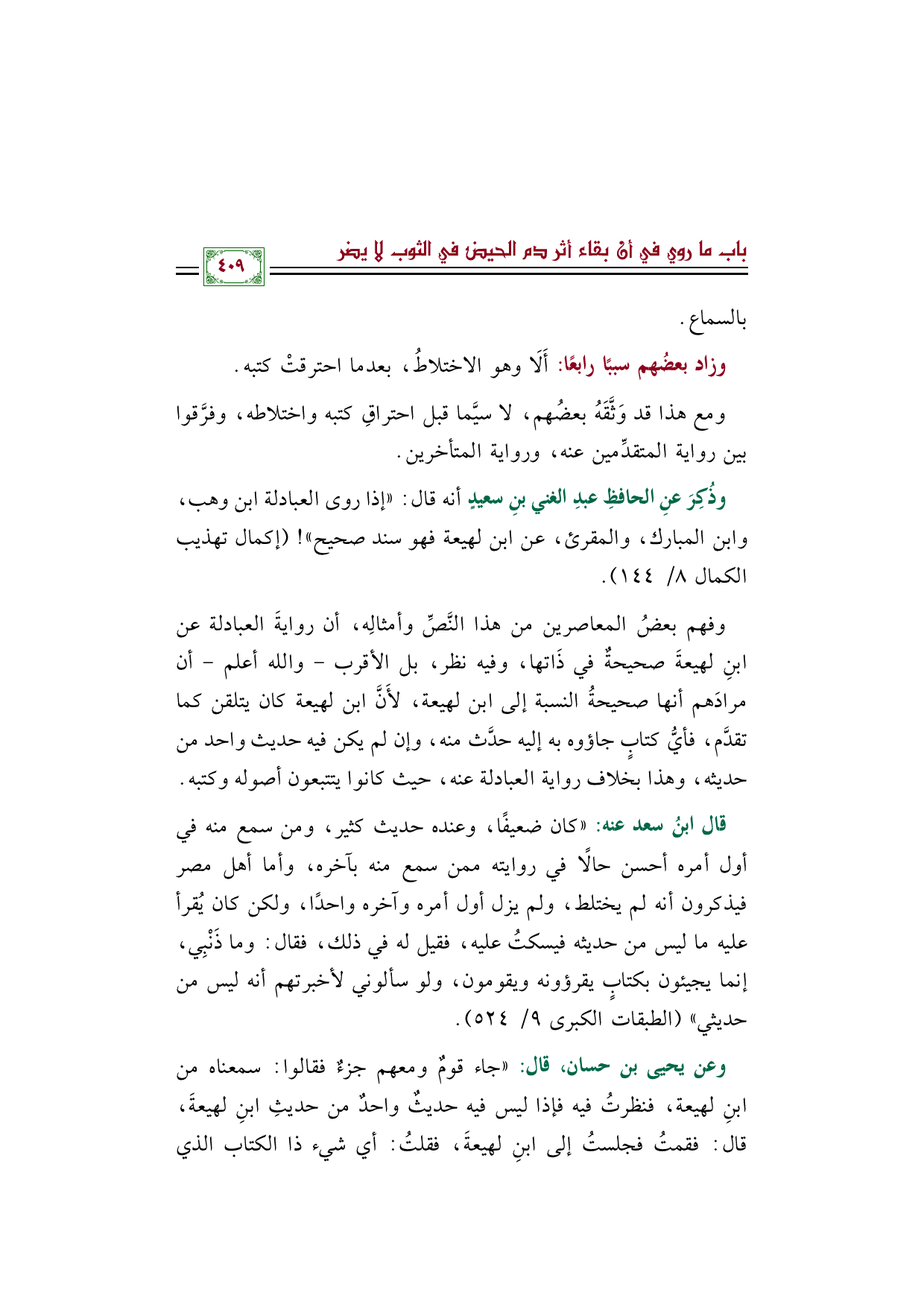 وذُكِرَ عنِ الحافظِ عبدِ الغني بنِ سعيدٍ أنه قال: ((إذا روى العبادلة ابن وهب، وابن المبارك، والمقرئ، عن ابن لهيعة فهو سند صحيح))! (إكمال تهذيب الكمال ٨/ ١٤٤).