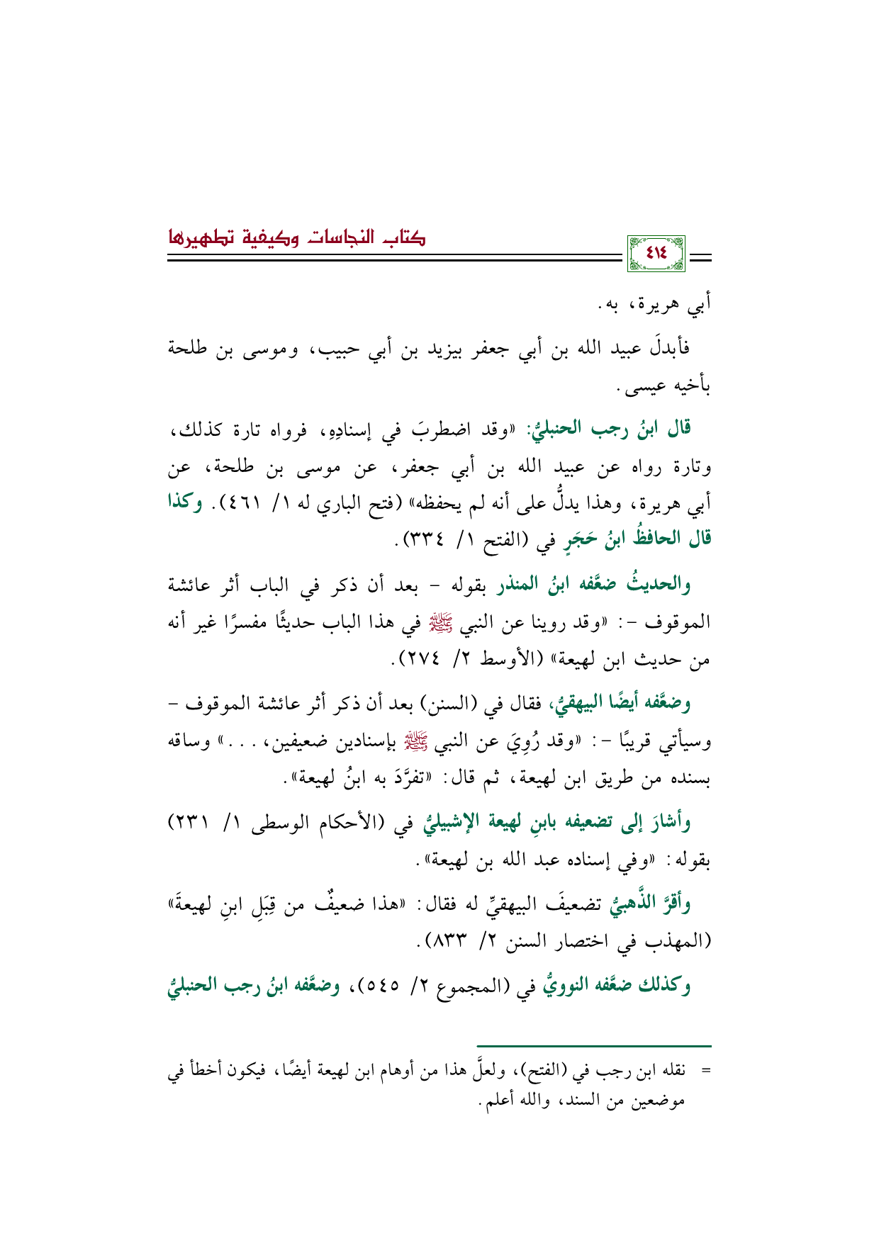 وكذلك ضعَّفه النوويُّ في (المجموع ٢/ ٥٤٥)، وضعَّفه ابنُ رجب الحنبليُّ