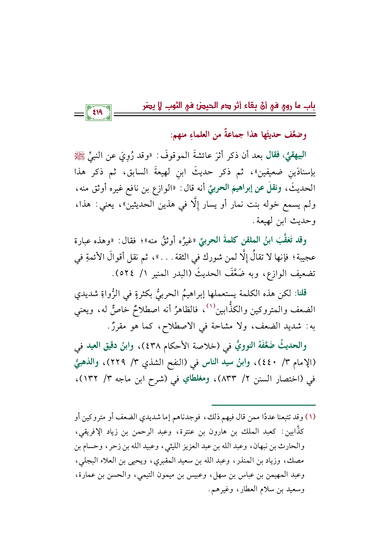 البيهقيُّ، فقال بعد أن ذكر أثرَ عائشةَ الموقوفَ: ((وقد رُوِيَ عن النبيِّ صلى الله عليه وسلم بإسنادَينِ ضعيفين))، ثم ذكر حديثَ ابنِ لهيعةَ السابق، ثم ذكر هذا الحديثَ، ونقلَ عن إبراهيمَ الحربيِّ أنه قال: ((الوازع بن نافع غيره أوثق منه، ولم يسمع خوله بنت نمار أو يسار إِلَّا في هذين الحديثين))، يعني: هذا، وحديث ابن لهيعة.