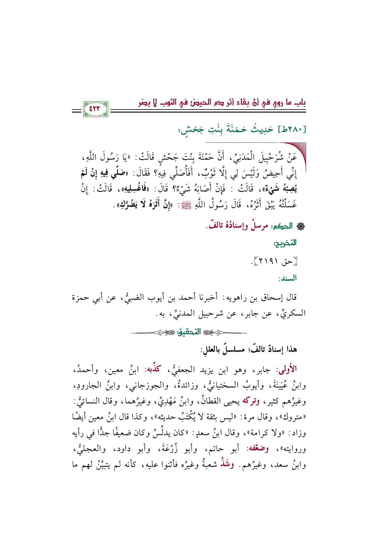 الأولى: جابر، وهو ابن يزيد الجعفيُّ، كذَّبه: ابنُ معين، وأحمدُ، وابنُ عُيَينَةَ، وأيوبُ السختيانيُّ، وزائدةُ، والجوزجاني، وابنُ الجارودِ، وغيرُهم كثير، وتركه يحيى القطانُ، وابنُ مَهْدِيِّ، وغيرُهما، وقال النسائيُّ: ((متروك))، وقال مرة: ((ليس بثقة لا يُكْتَبُ حديثه))، وكذا قال ابنُ معين أيضًا وزاد: ((ولا كرامة))، وقال ابنُ سعدٍ: ((كان يدلِّسُ وكان ضعيفًا جدًّا في رأيه وروايته))، وضعَّفه: أبو حاتم، وأبو زُرْعَةَ، وأبو داود، والعجليُّ، وابنُ سعد، وغيرُهم. وشَذَّ شعبةُ وغيرُه فأثنوا عليه، كأنه لم يتبيَّنْ لهم ما