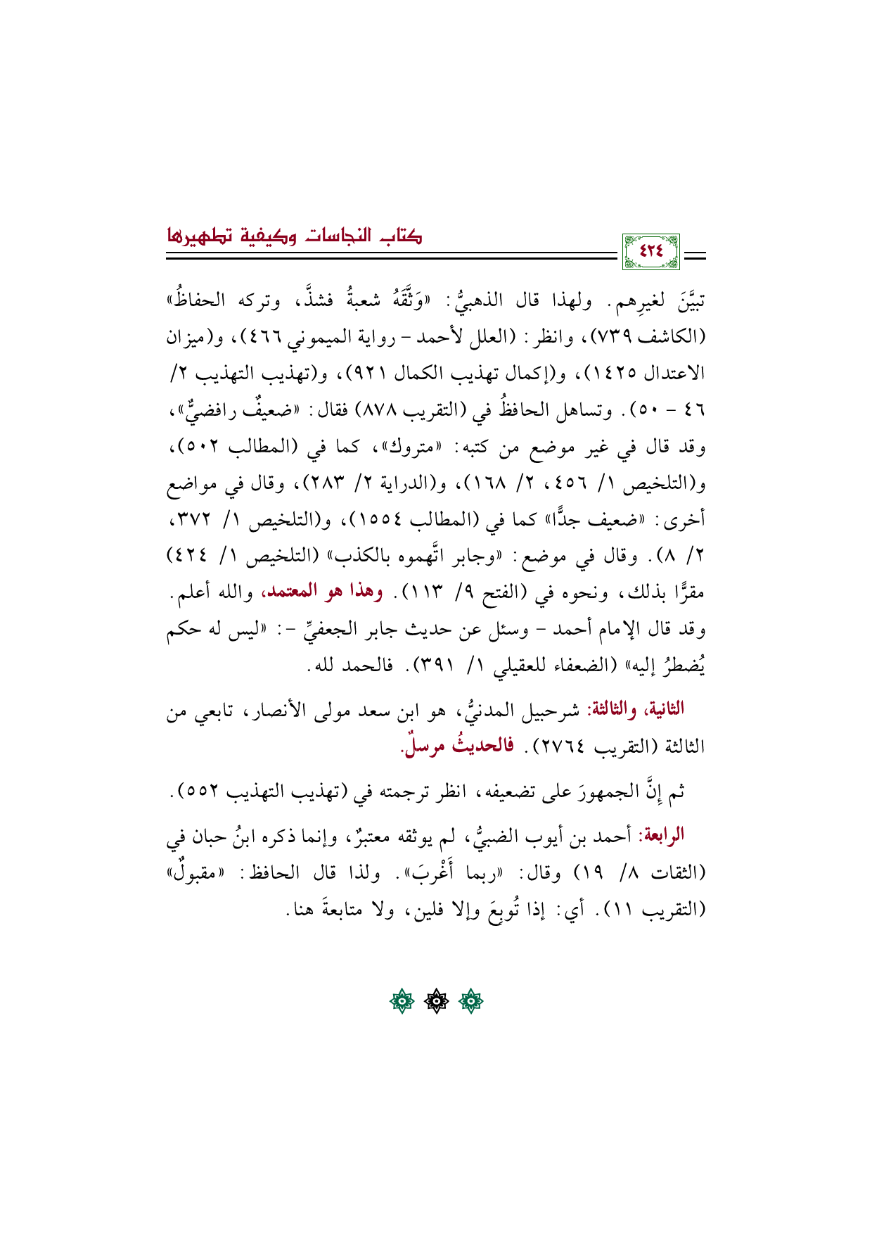 تبيَّنَ لغيرِهم. ولهذا قال الذهبيُّ: ((وَثَّقَهُ شعبةُ فشذَّ، وتركه الحفاظُ)) (الكاشف ٧٣٩)، وانظر: (العلل لأحمد -رواية الميموني ٤٦٦)، و (ميزان الاعتدال ١٤٢٥)، و (إكمال تهذيب الكمال ٩٢١)، و (تهذيب التهذيب ٢/ ٤٦ - ٥٠). وتساهل الحافظُ في (التقريب ٨٧٨) فقال: ((ضعيفٌ رافضيٌّ))، وقد قال في غير موضع من كتبه: ((متروك))، كما في (المطالب ٥٠٢)، و (التلخيص ١/ ٤٥٦، ٢/ ١٦٨)، و (الدراية ٢/ ٢٨٣)، وقال في مواضع أخرى: ((ضعيف جدًّا)) كما في (المطالب ١٥٥٤)، و (التلخيص ١/ ٣٧٢، ٢/ ٨). وقال في موضع: ((وجابر اتَّهموه بالكذب)) (التلخيص ١/ ٤٢٤) مقرًّا بذلك، ونحوه في (الفتح ٩/ ١١٣). وهذا هو المعتمد، والله أعلم. وقد قال الإمام أحمد -وسئل عن حديث جابر الجعفيِّ-: ((ليس له حكم يُضطرُ إليه)) (الضعفاء للعقيلي ١/ ٣٩١). فالحمد لله.