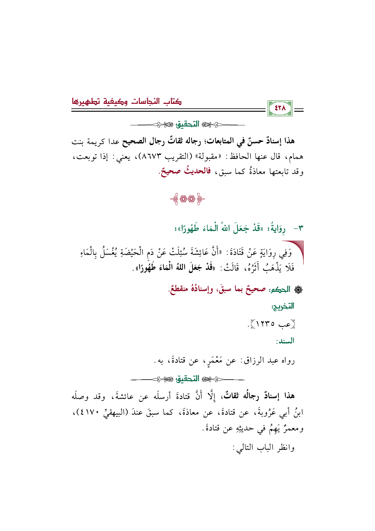 هذا إسنادٌ رجالُه ثقاتٌ، إِلَّا أَنَّ قتادةَ أرسلَه عن عائشةَ، وقد وصلَه ابنُ أبي عَرُوبةَ، عن قتادةَ، عن معاذةَ، كما سبقَ عندَ (البيهقيِّ ٤١٧٠)، ومعمرٌ يَهِمُ في حديثِهِ عن قتادةَ.