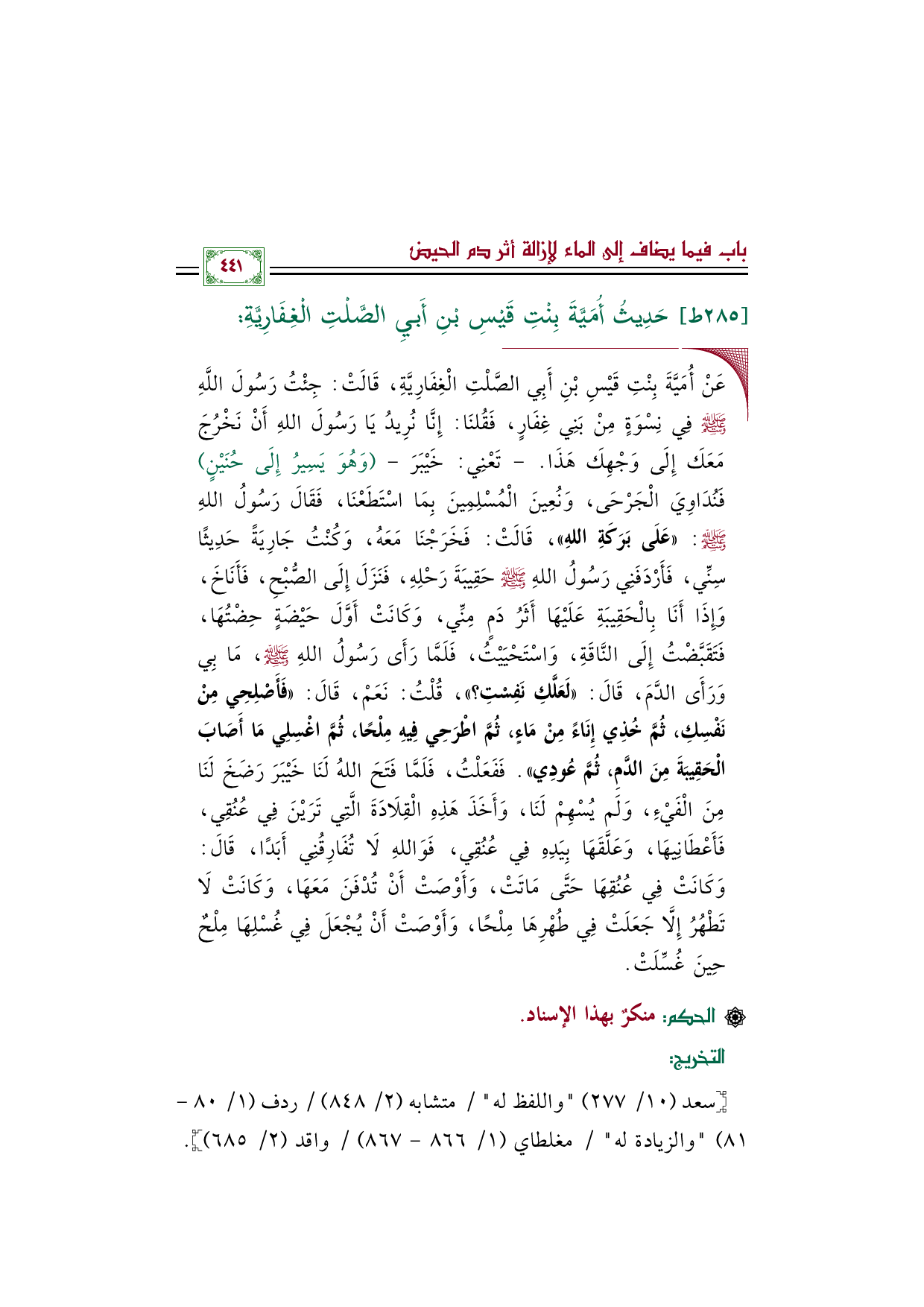 ◼ عَنْ أُمَيَّةَ بِنْتِ قَيْسِ بْنِ أَبِي الصَّلْتِ الْغِفَارِيَّةِ، قَالَتْ: جِئْتُ رَسُولَ اللَّهِ صلى الله عليه وسلم فِي نِسْوَةٍ مِنْ بَنِي غِفَارٍ، فَقُلنَا: إِنَّا نُرِيدُ يَا رَسُولَ اللهِ أَنْ نَخْرُجَ مَعَكَ إِلَى وَجْهِكَ هَذَا. -تَعْنِي: خَيْبَرَ- (وَهُوَ يَسِيرُ إِلَى حُنَيْنٍ) فَنُدَاوِيَ الْجَرْحَى، وَنُعِينَ الْمُسْلِمِينَ بِمَا اسْتَطَعْنَا، فَقَالَ رَسُولُ اللهِ صلى الله عليه وسلم: ((عَلَى بَرَكَةِ اللهِ))، قَالَتْ: فَخَرَجْنَا مَعَهُ، وَكُنْتُ جَارِيَةً حَدِيثًا سِنِّي، فَأَرْدَفَنِي رَسُولُ اللهِ صلى الله عليه وسلم حَقِيبَةَ رَحْلِهِ، فَنَزَلَ إِلَى الصُّبْحِ، فَأَنَاخَ، وَإِذَا أَنَا بِالْحَقِيبَةِ عَلَيْهَا أَثَرُ دَمٍ مِنِّي، وَكَانَتْ أَوَّلَ حَيْضَةٍ حِضْتُهَا، فَتَقَبَّضْتُ إِلَى النَّاقَةِ، وَاسْتَحْيَيْتُ، فَلَمَّا رَأَى رَسُولُ اللهِ صلى الله عليه وسلم، مَا بِي وَرَأَى الدَّمَ، قَالَ: ((لَعَلَّكِ نَفِسْتِ؟ ))، قُلْتُ: نَعَمْ، قَالَ: ((فَأَصْلِحِي مِنْ نَفْسِكِ، ثُمَّ خُذِي إِنَاءً مِنْ مَاءٍ، ثُمَّ اطْرَحِي فِيهِ مِلْحًا، ثُمَّ اغْسِلِي مَا أَصَابَ الْحَقِيبَةَ مِنَ الدَّمِ، ثُمَّ عُودِي)). فَفَعَلْتُ، فَلَمَّا فَتَحَ اللهُ لَنَا خَيْبَرَ رَضَخَ لَنَا مِنَ الْفَيْءِ، وَلَم يُسْهِمْ لَنَا، وَأَخَذَ هَذِهِ الْقِلَادَةَ الَّتِي تَرَيْنَ فِي عُنُقِي، فَأَعْطَانِيهَا، وَعَلَّقَهَا بِيَدِهِ فِي عُنُقِي، فَوَاللهِ لَا تُفَارِقُنِي أَبَدًا، قَالَ: وَكَانَتْ فِي عُنُقِهَا حَتَّى مَاتَتْ، وَأَوْصَتْ أَنْ تُدْفَنَ مَعَهَا، وَكَانَتْ لَا تَطْهُرُ إِلَّا جَعَلَتْ فِي طُهْرِهَا مِلْحًا، وَأَوْصَتْ أَنْ يُجْعَلَ فِي غُسْلِهَا مِلْحٌ حِينَ غُسِّلَتْ.