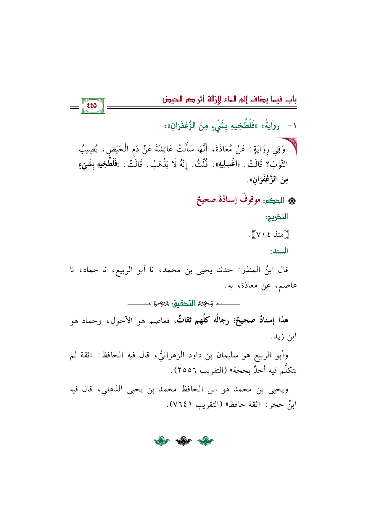 قال ابنُ المنذر: حدثنا يحيى بن محمد، نا أبو الربيع، نا حماد، نا عاصم، عن معاذة، به.