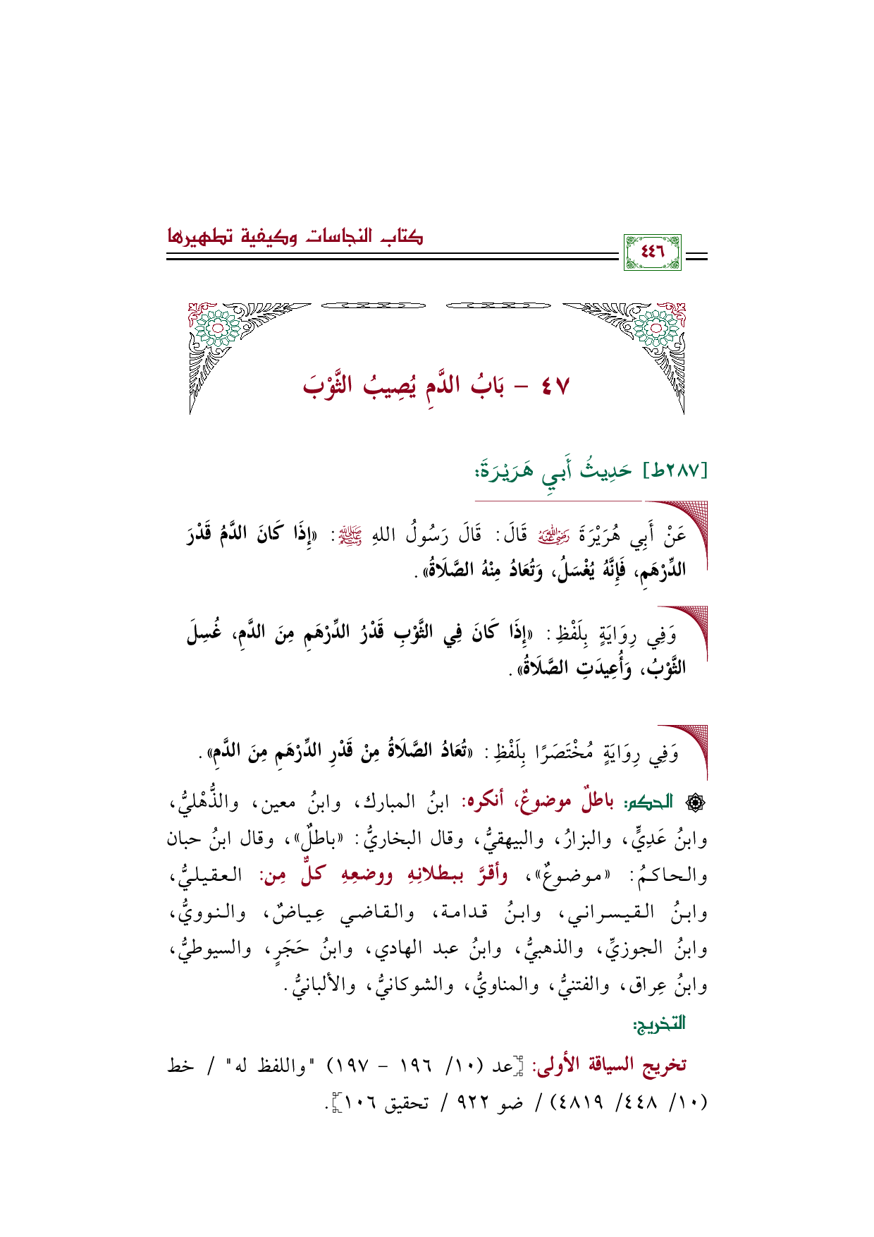 ◼ عَنْ أَبِي هُرَيْرَةَ رضي الله عنه قَالَ: قَالَ رَسُولُ اللهِ صلى الله عليه وسلم: ((إِذَا كَانَ الدَّمُ قَدْرَ الدِّرْهَمِ، فَإِنَّهُ يُغْسَلُ، وَتُعَادُ مِنْهُ الصَّلَاةُ)).