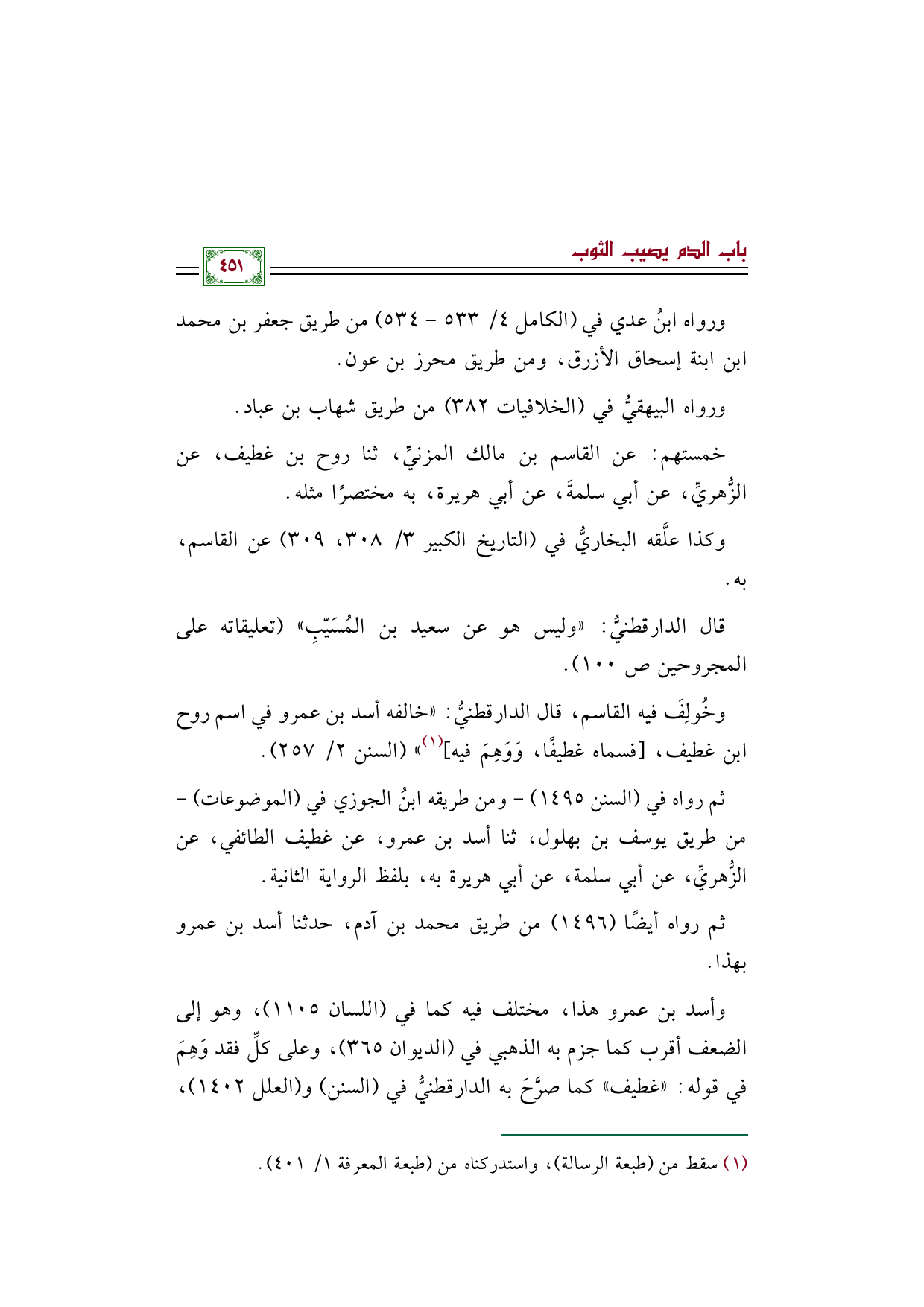 وأسد بن عمرو هذا، مختلف فيه كما في (اللسان ١١٠٥)، وهو إلى الضعف أقرب كما جزم به الذهبي في (الديوان ٣٦٥)، وعلى كلِّ فقد وَهِمَ في قوله: ((غطيف)) كما صرَّحَ به الدارقطنيُّ في (السنن) و (العلل ١٤٠٢)،