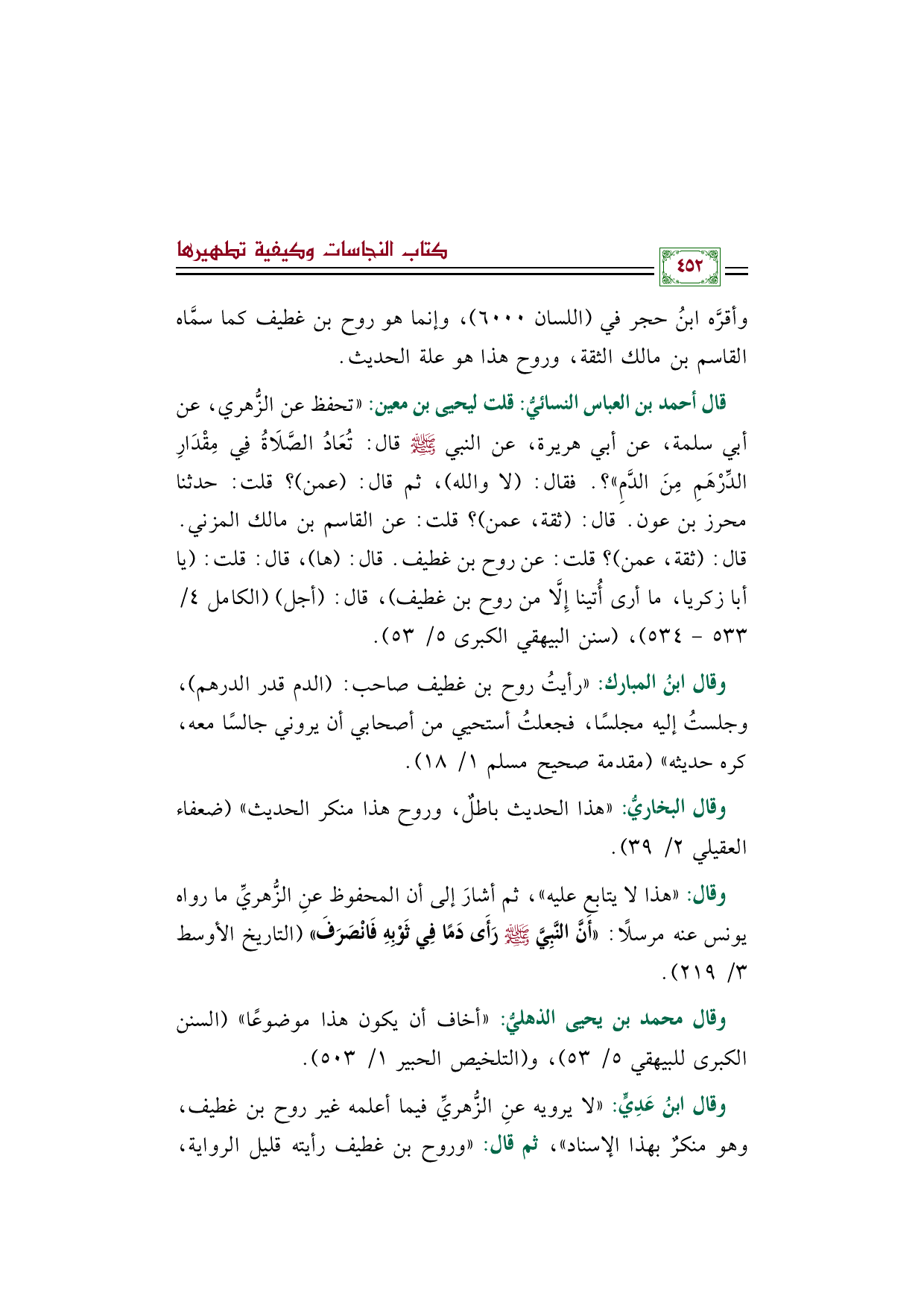 قال أحمد بن العباس النسائيُّ: قلت ليحيى بن معين: ((تحفظ عن الزُّهري، عن أبي سلمة، عن أبي هريرة، عن النبي صلى الله عليه وسلم قال: تُعَادُ الصَّلَاةُ فِي مِقْدَارِ الدِّرْهَمِ مِنَ الدَّمِ))؟ . فقال: (لا والله)، ثم قال: (عمن)؟ قلت: حدثنا محرز بن عون. قال: (ثقة، عمن)؟ قلت: عن القاسم بن مالك المزني. قال: (ثقة، عمن)؟ قلت: عن روح بن غطيف. قال: (ها)، قال: قلت: (يا أبا زكريا، ما أرى أُتينا إِلَّا من روح بن غطيف)، قال: (أجل) (الكامل ٤/ ٥٣٣ - ٥٣٤)، (سنن البيهقي الكبرى ٥/ ٥٣).