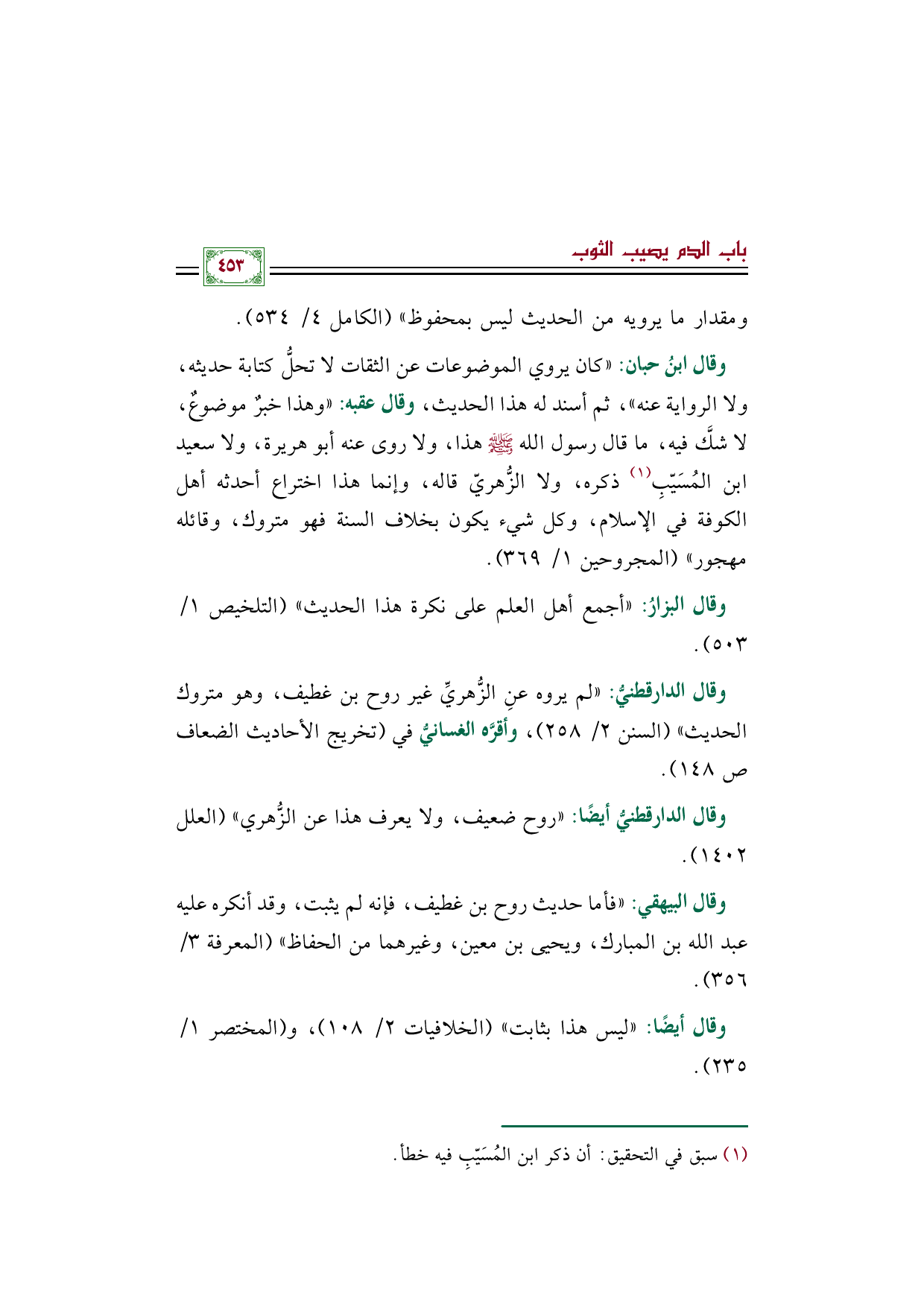 وقال الدارقطنيُّ: ((لم يروه عنِ الزُّهريِّ غير روح بن غطيف، وهو متروك الحديث)) (السنن ٢/ ٢٥٨)، وأقرَّه الغسانيُّ في (تخريج الأحاديث الضعاف صـ ١٤٨).