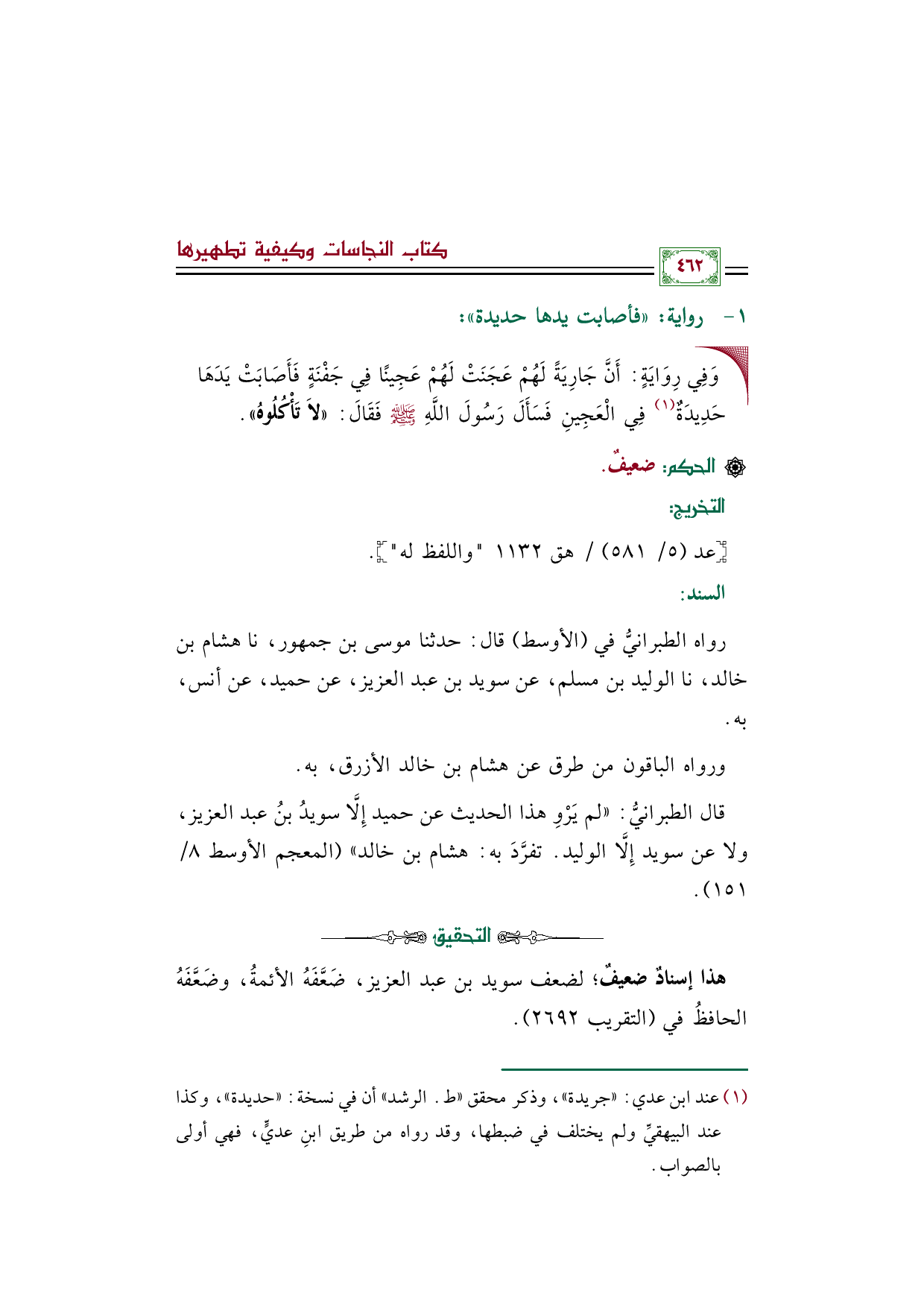 (¬١) عند ابن عدي: ((جريدة))، وذكر محقق ((ط. الرشد)) أن في نسخة: ((حديدة))، وكذا عند البيهقيِّ ولم يختلف في ضبطها، وقد رواه من طريق ابنِ عديٍّ، فهي أولى بالصواب.