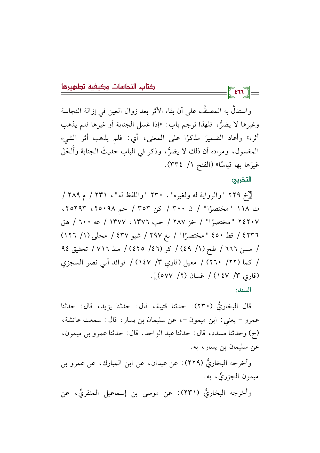 واستدلَّ به المصنفُ على أن بقاء الأثر بعد زوال العين في إزالة النجاسة وغيرها لا يضرُّ، فلهذا ترجم باب: ((إذا غسل الجنابة أو غيرها فلم يذهب أثره)) وأعاد الضميرَ مذكرًا على المعنى، أي: فلم يذهب أثر الشيء المغسول، ومراده أن ذلك لا يضرُّ، وذكر في الباب حديثَ الجنابة وأَلحَقَ غيرَها بها قياسًا)) (الفتح ١/ ٣٣٤).