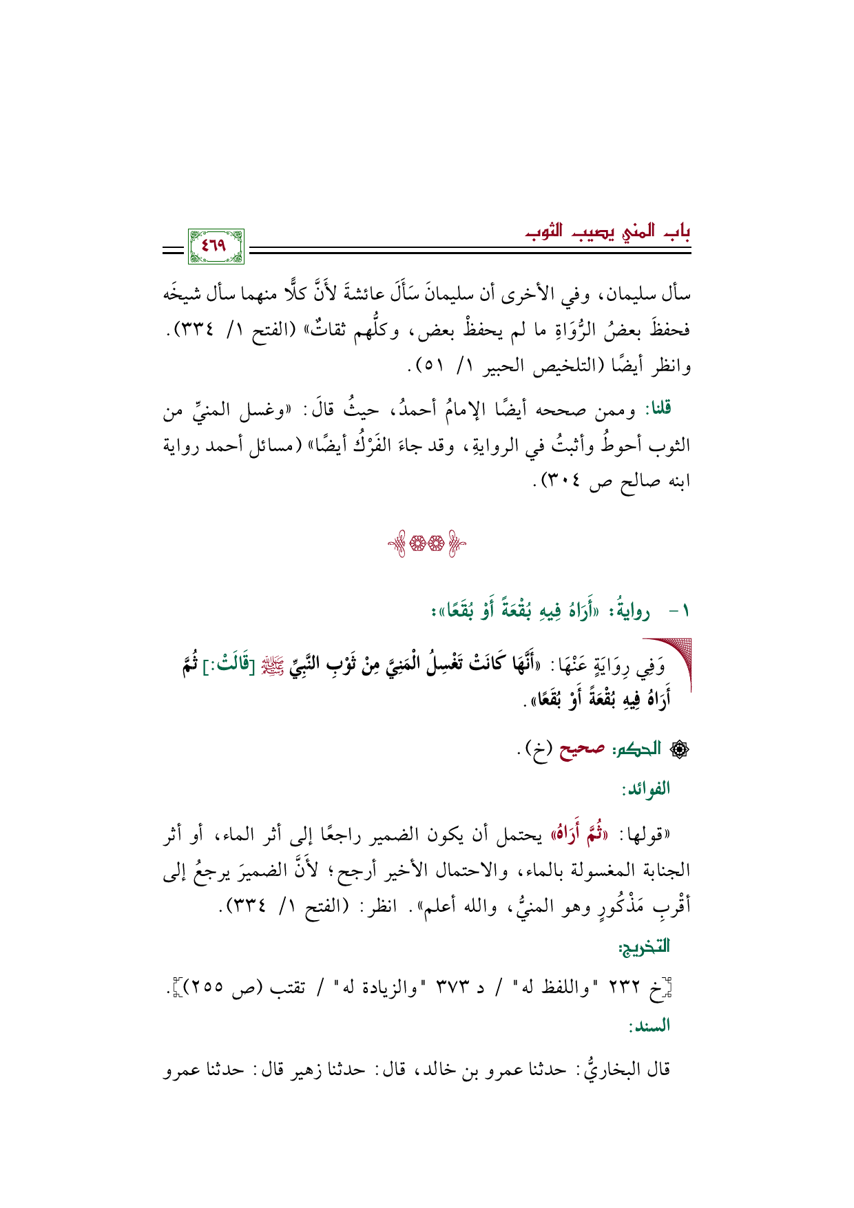 قلنا: وممن صححه أيضًا الإمامُ أحمدُ، حيثُ قالَ: ((وغسل المنيِّ من الثوب أحوطُ وأثبتُ في الروايةِ، وقد جاءَ الفَرْكُ أيضًا)) (مسائل أحمد رواية ابنه صالح صـ ٣٠٤).