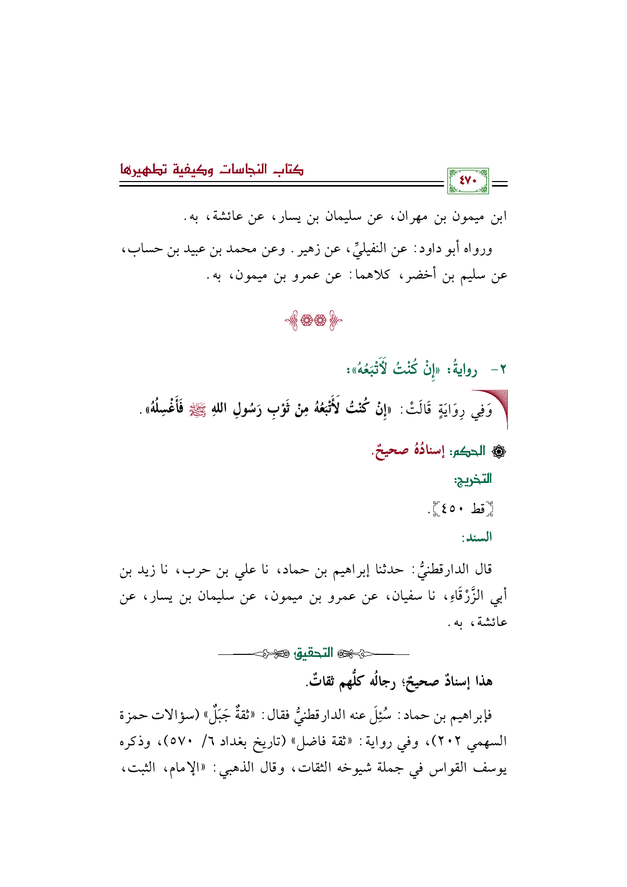 قال الدارقطنيُّ: حدثنا إبراهيم بن حماد، نا علي بن حرب، نا زيد بن أبي الزَّرْقَاءِ، نا سفيان، عن عمرو بن ميمون، عن سليمان بن يسار، عن عائشة، به.